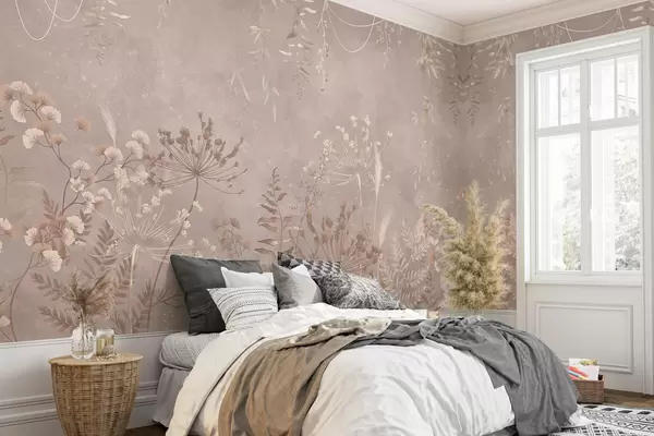 Fototapeten Zartes beigefarbenes Pflanzenmuster mit Wildblumen N° w05092v2