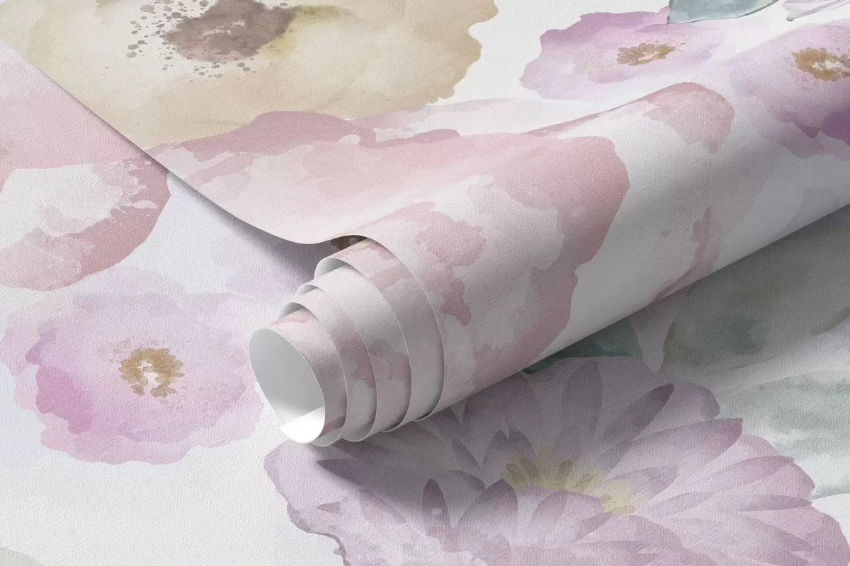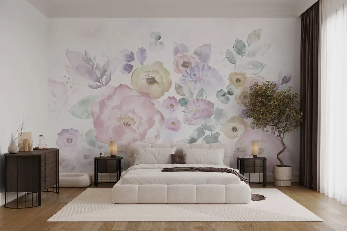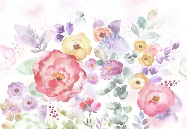 Fototapeten Sanfte Aquarellkomposition mit Blumen und Blättern N° w05093