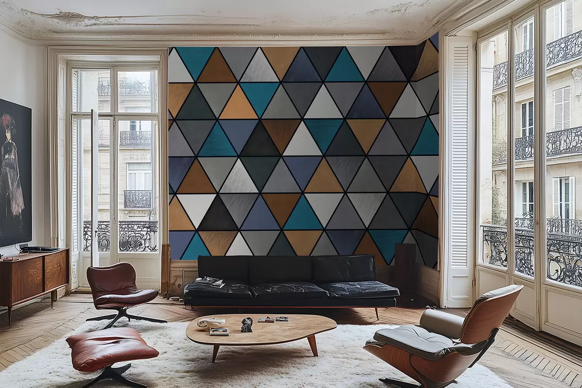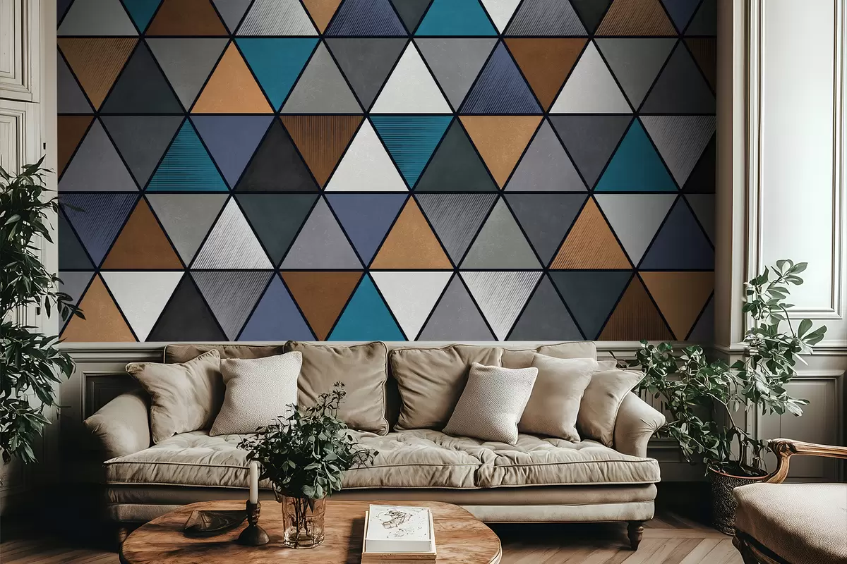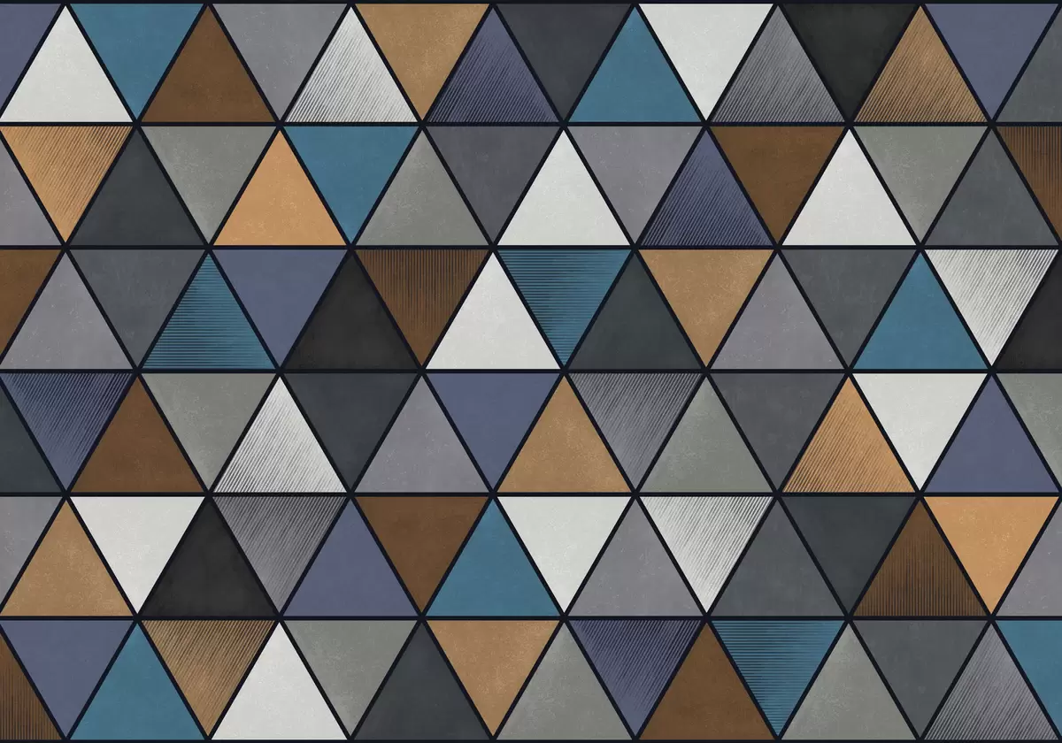 Fototapeten Dreieckiges geometrisches Muster in Blau- und Warmtönen N° w05095