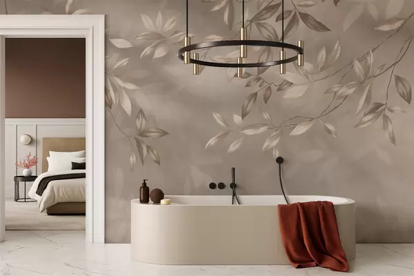 Fototapeten Elegante, grüne Zweige in Beigetönen auf hellem Hintergrund N° w05113