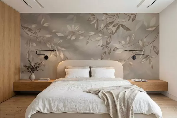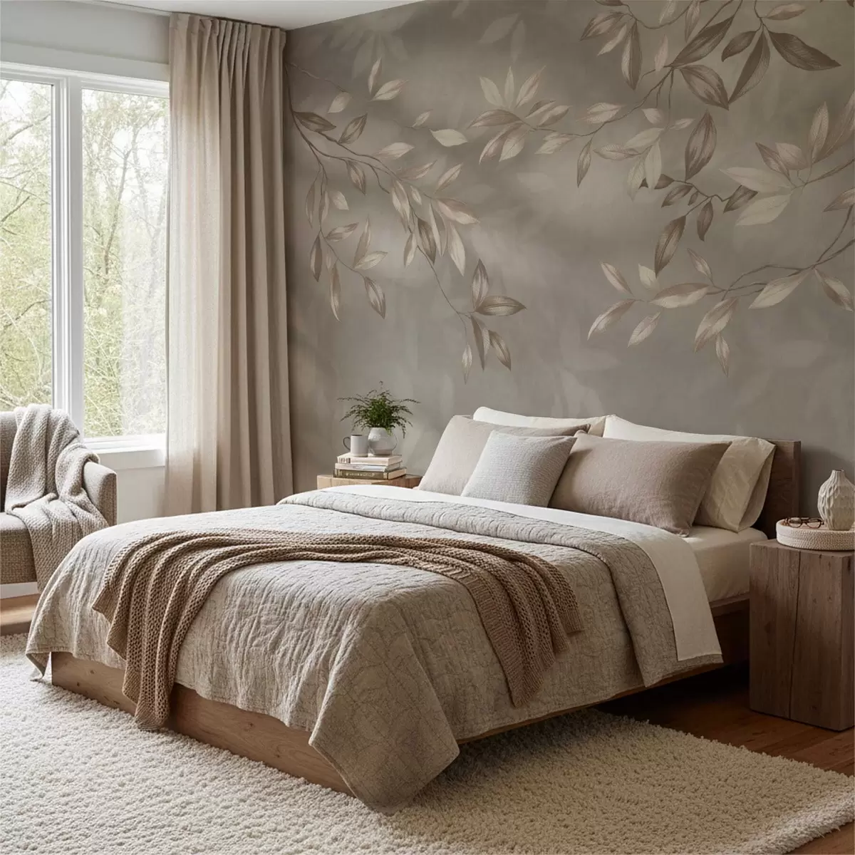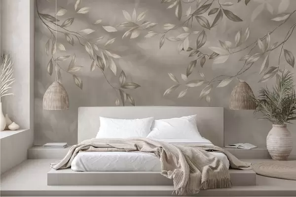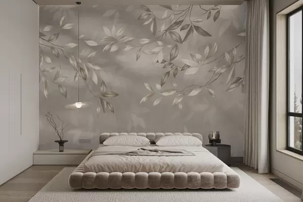 Fototapete Elegante, grüne Zweige in Beigetönen auf hellem Hintergrund w05113