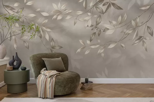 Fototapeten Elegante, grüne Zweige in Beigetönen auf hellem Hintergrund N° w05113
