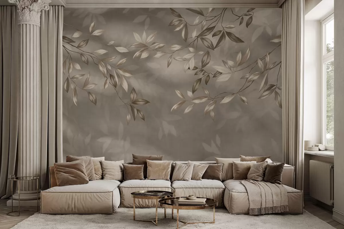 Fototapeten Zarte, blättrige Zweige in Beigetönen auf hellem Hintergrund N° w05113v2
