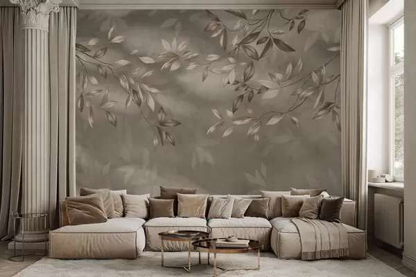 Fototapeten Zarte, blättrige Zweige in Beigetönen auf hellem Hintergrund N° w05113v2