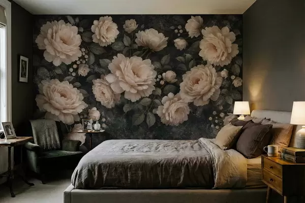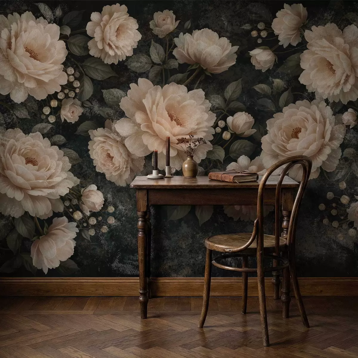 Fototapeten Voluminöse Blumen in Beigetönen auf dunklem Hintergrund N° w05114