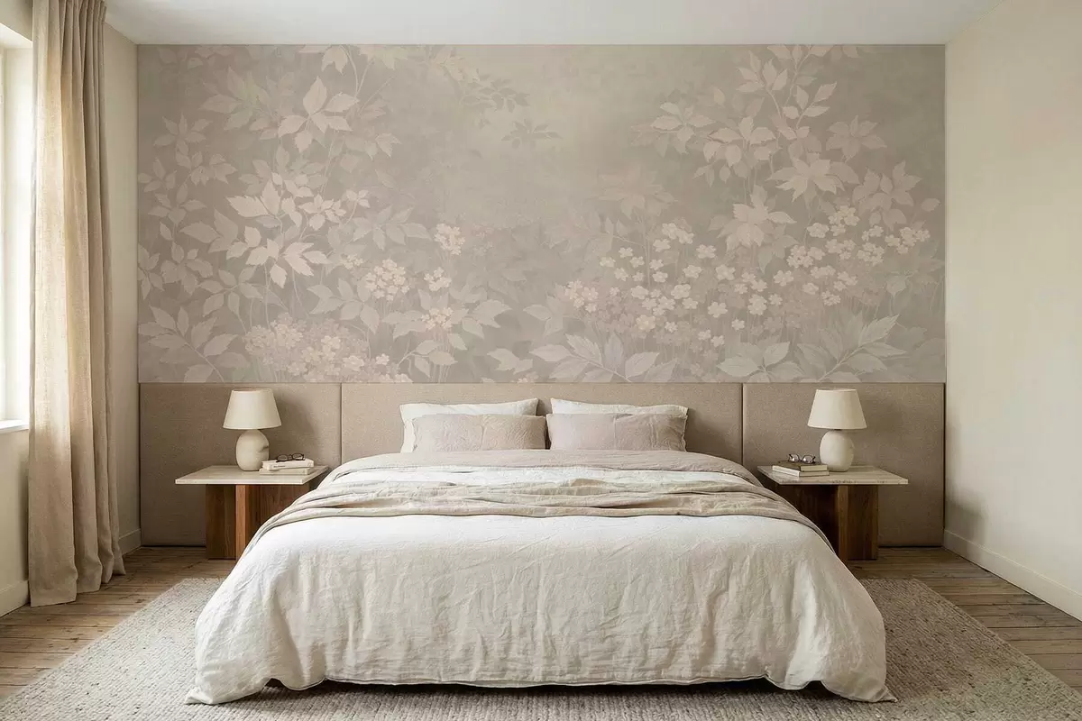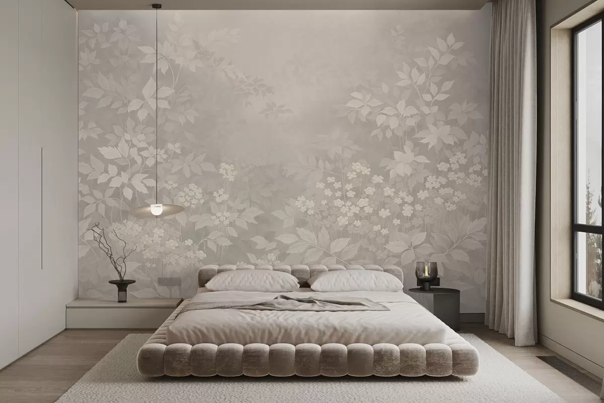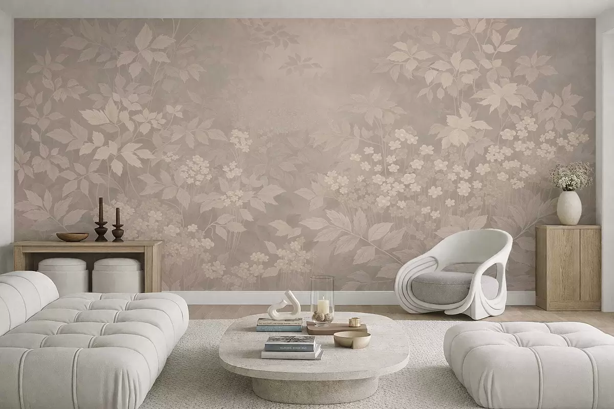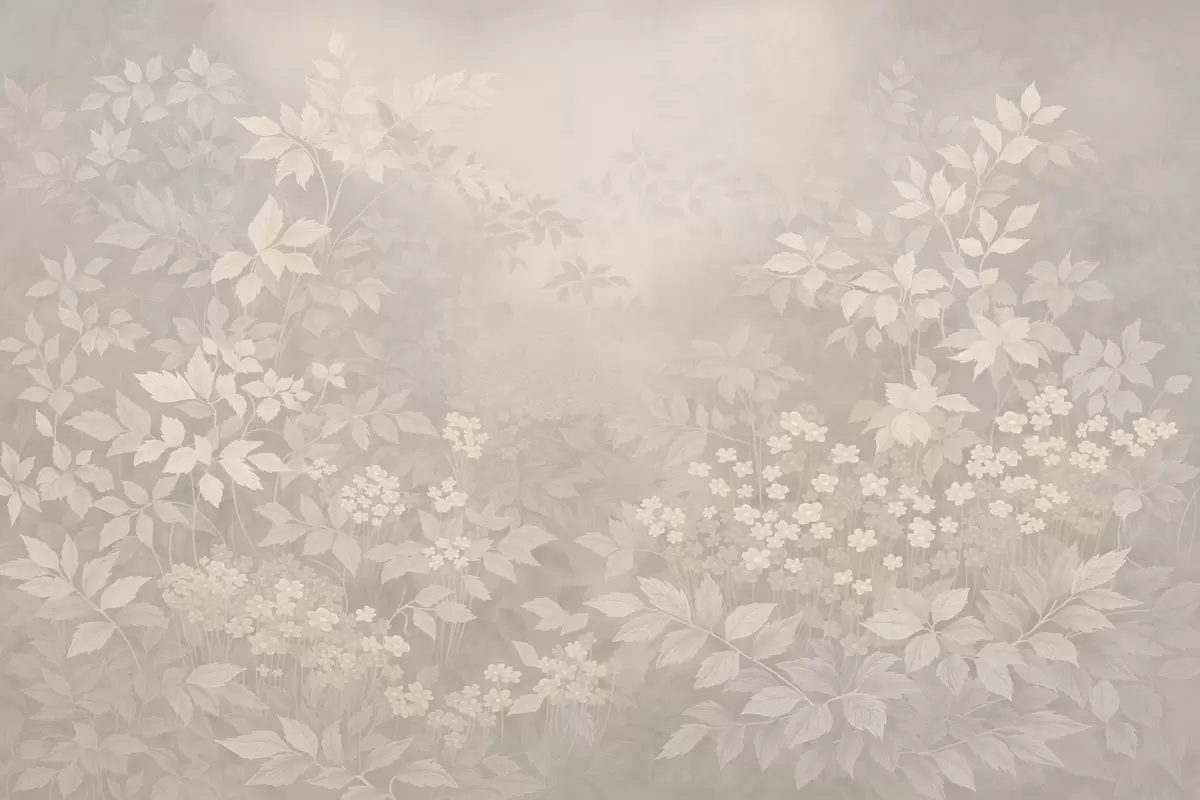 Fototapeten Zartes botanisches Muster mit Blättern und Blüten im Nebel N° w05115v1