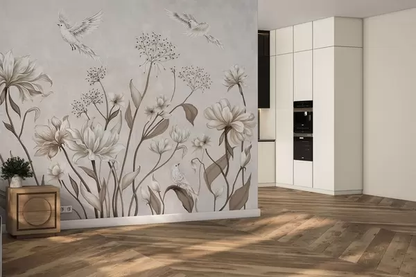 Fototapeten Helle Blumen und Vögel vor einem sanften Hintergrund N° w05118
