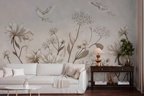 Fototapeten Helle Blumen und Vögel vor einem sanften Hintergrund N° w05118