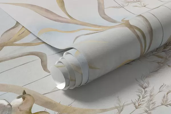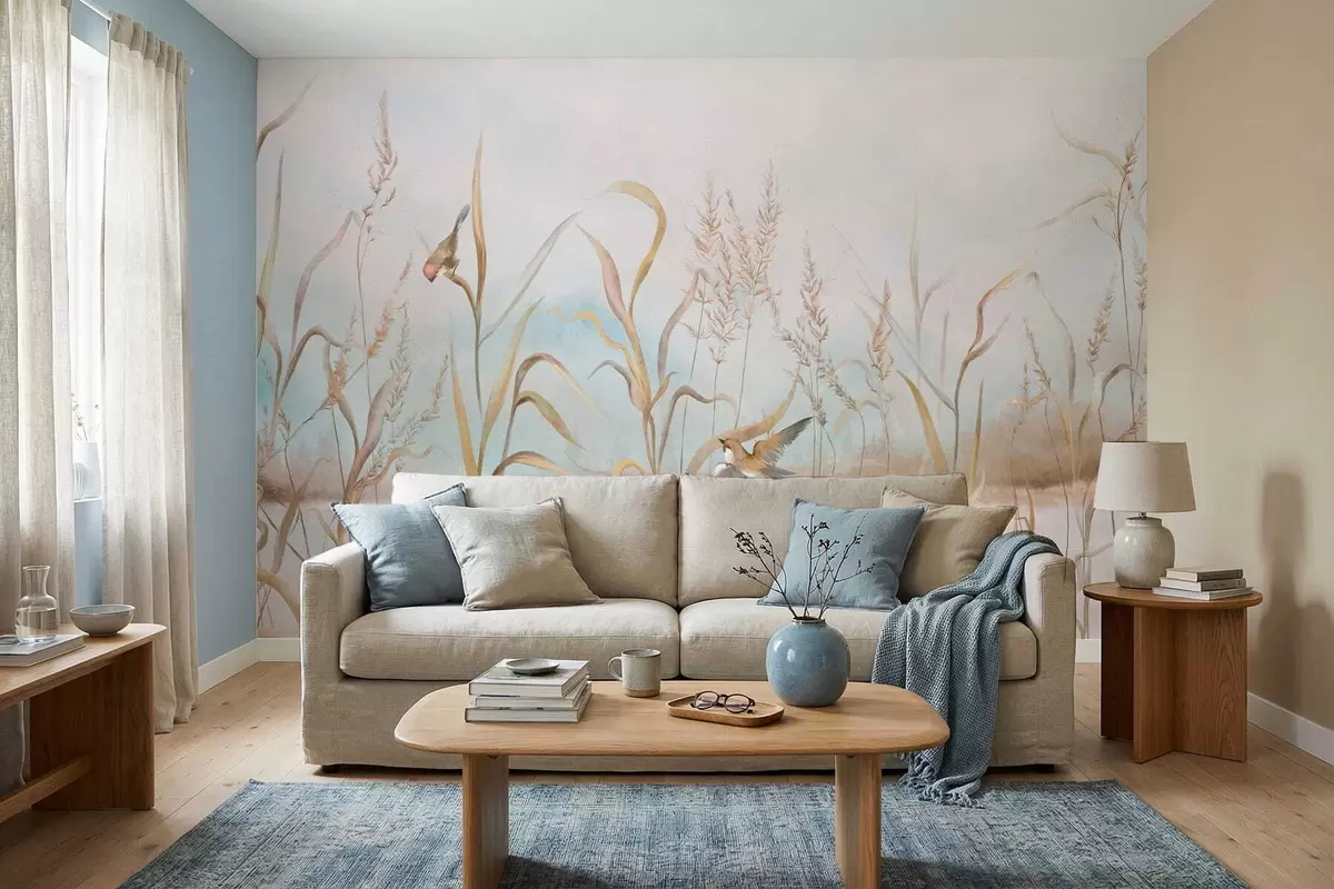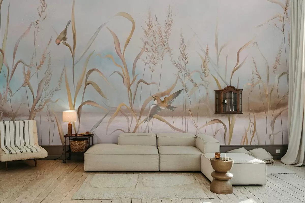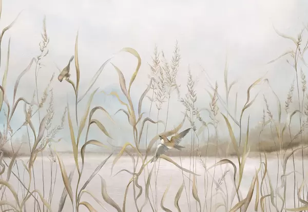 Fototapeten Illustration von Schilf und Vögeln am Wasser in sanften Farbtönen N° w05125