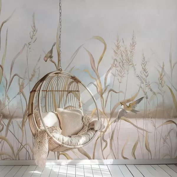 Fototapeten Illustration von Schilf und Vögeln am Wasser in sanften Farbtönen N° w05125