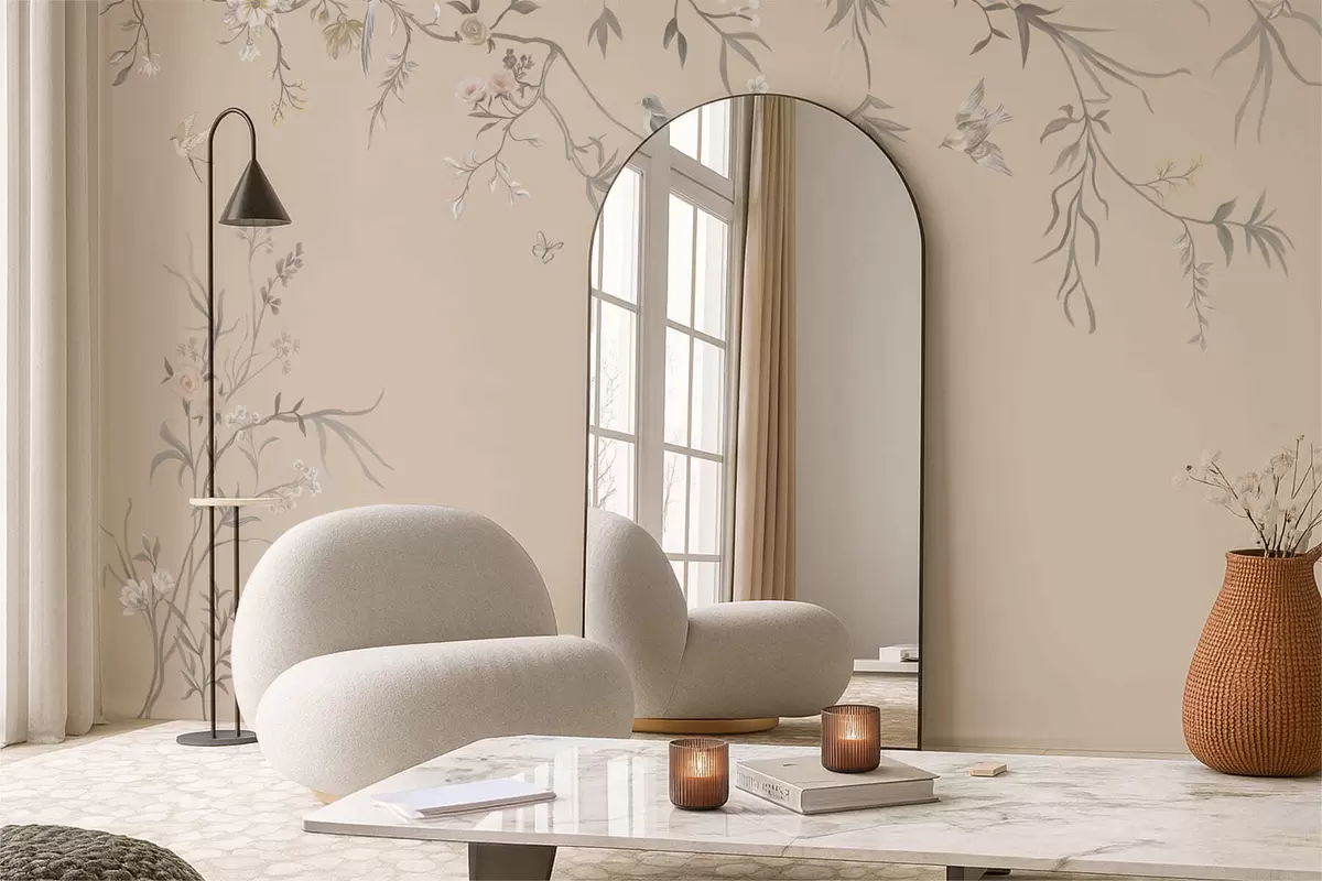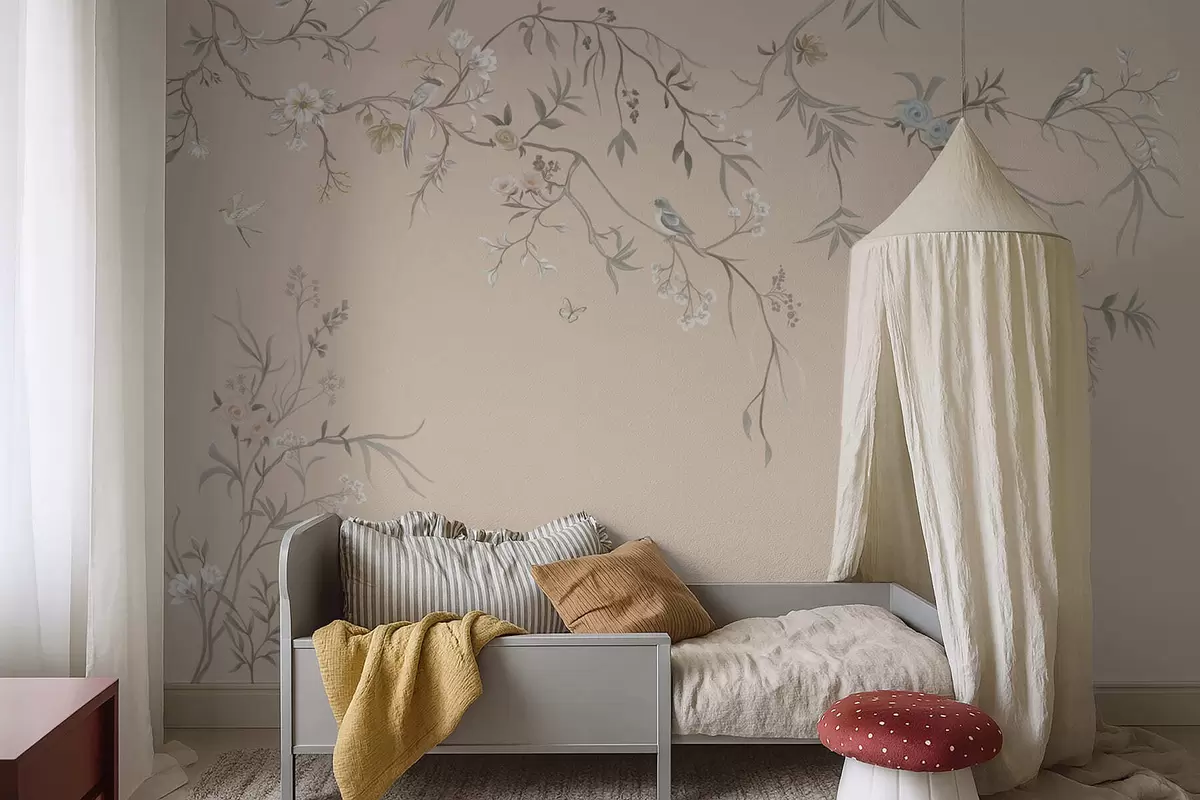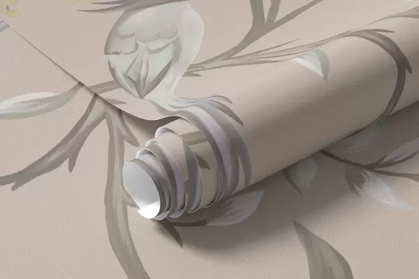 Fototapeten Blumenzweige mit Vögeln auf warmem beigem Hintergrund N° w05127v1
