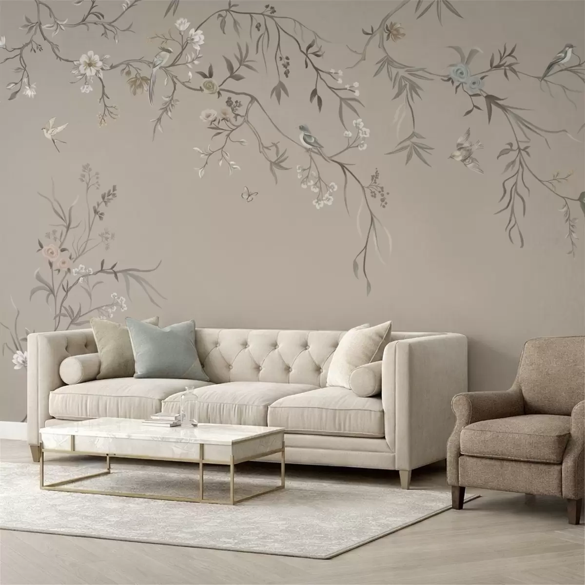 Fototapeten Blumenornament mit Vögeln auf neutralem Hintergrund N° w05127v3
