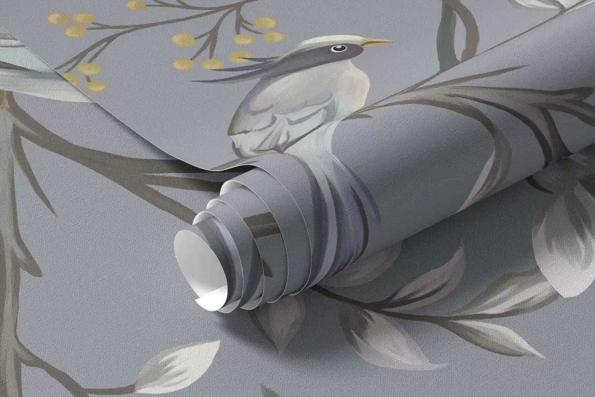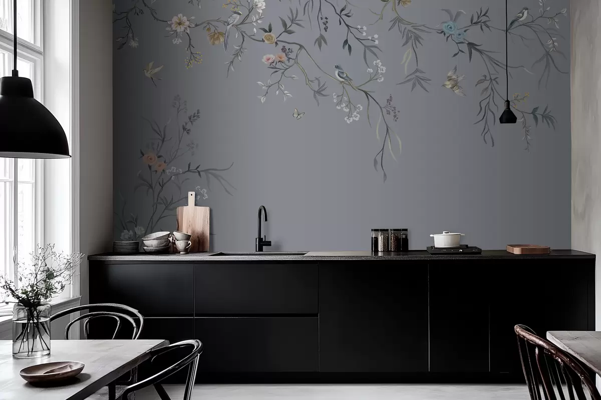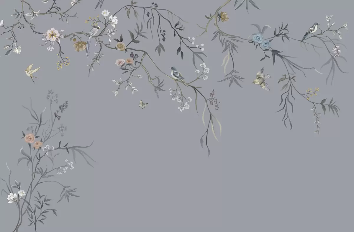 Fototapeten Blumenzweige mit Vögeln auf grünlichem Hintergrund N° w05127v5