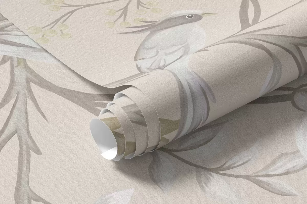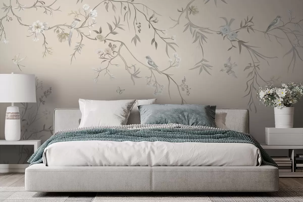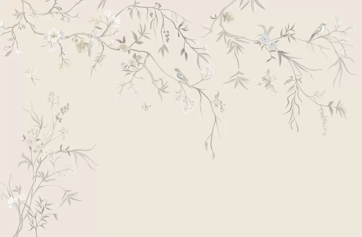 Fototapeten Blumenzweige mit Vögeln auf hellem Hintergrund N° w05127v7