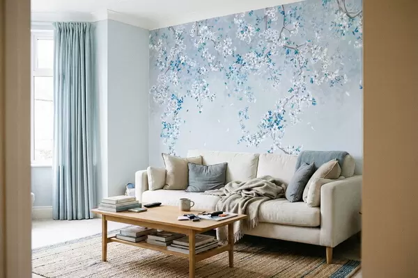Fototapeten Zweige mit weißen und blauen Blüten vor einem kühlen Hintergrund N° w05129v2