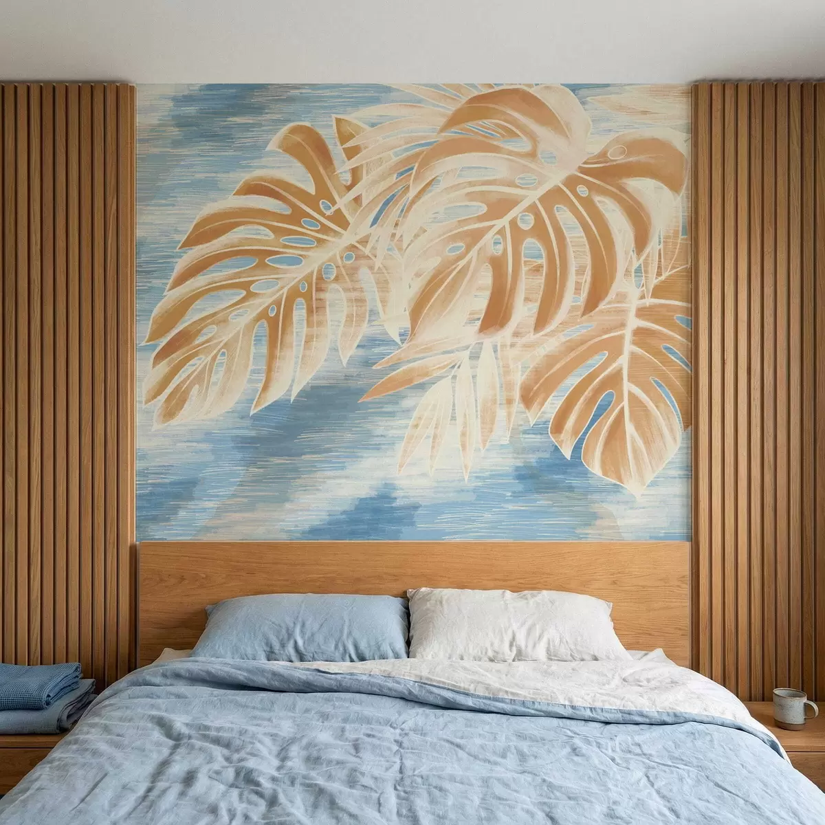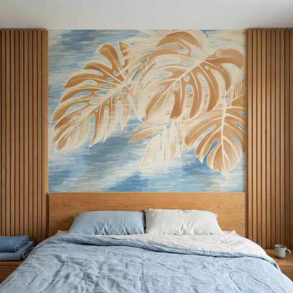 Fototapeten Blätter in hellen Sandtönen auf blauem Hintergrund N° w05130v1