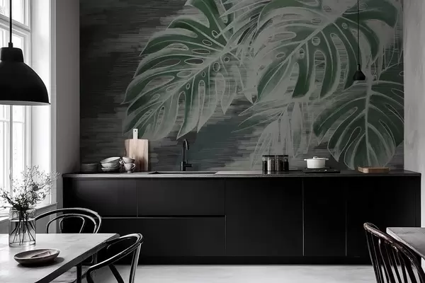 Fototapeten Dunkelgrüne Blätter auf einem strukturierten dunklen Hintergrund N° w05130v4