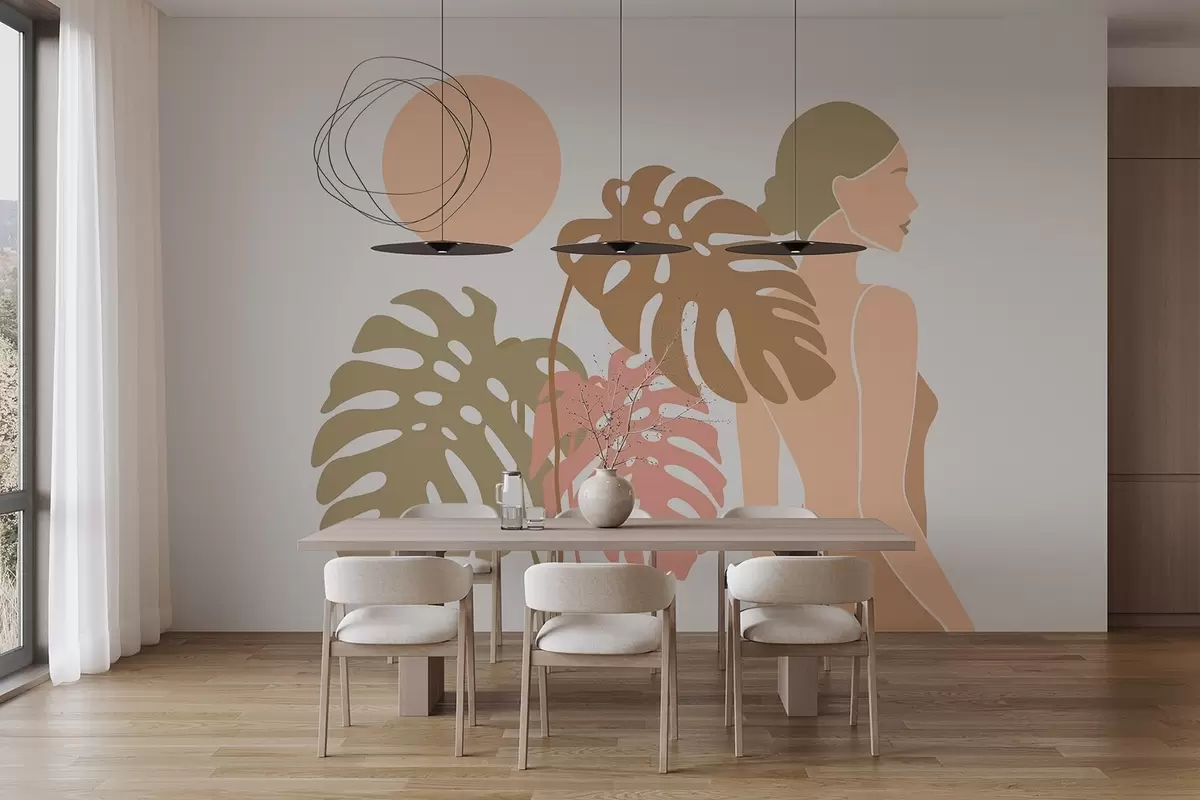 Fototapeten Silhouette einer Frau in der Nähe tropischer Blätter N° w05192v1