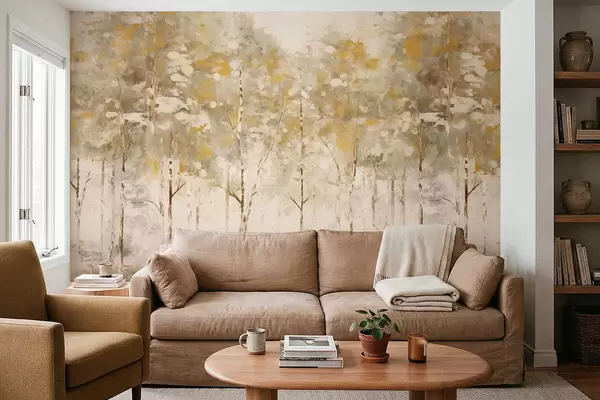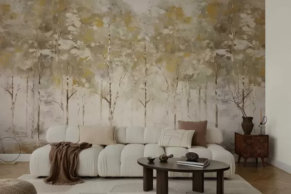 Fototapeten Stilisierter Wald mit schlanken Bäumen in warmen Farbtönen N° w05221
