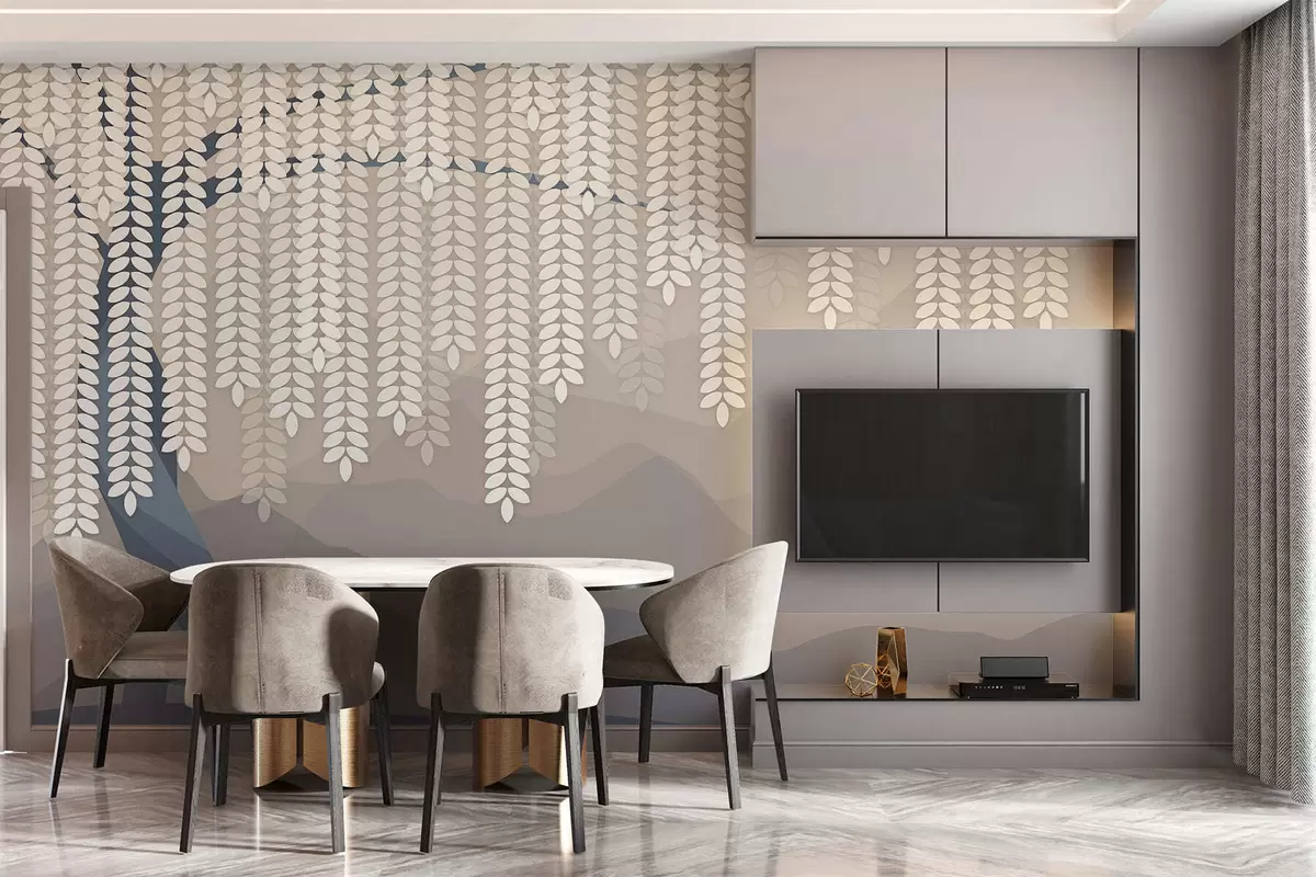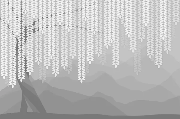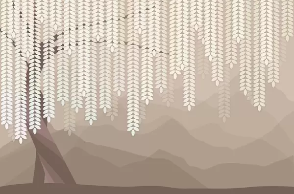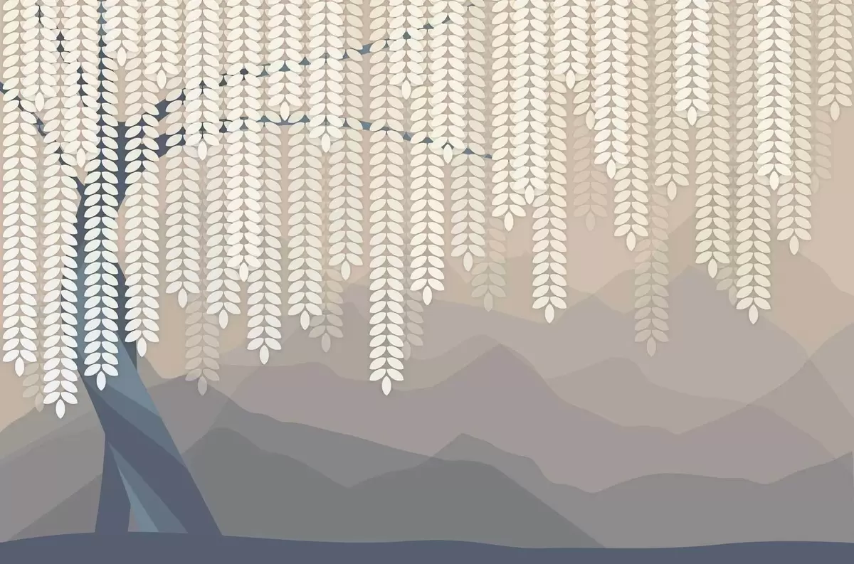 Fototapeten Stilisierter Weidenbaum mit herabhängenden Blättern vor dem Hintergrund minimalistischer Berge in Beige- und Blaugrüntönen N° w05232