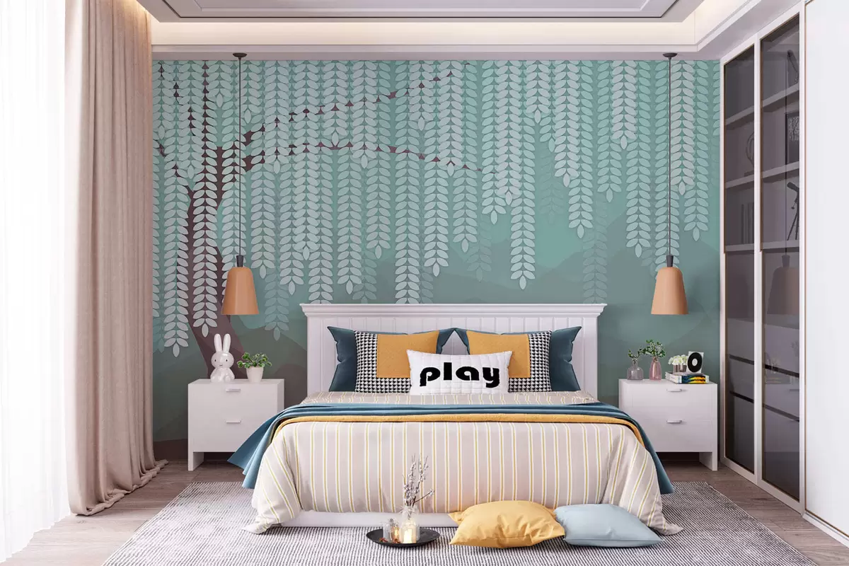 Fototapeten Stilisierter Weidenbaum mit herabhängenden Blättern vor dem Hintergrund minimalistischer Berge in Schokoladen- und Türkistönen N° w05232v1