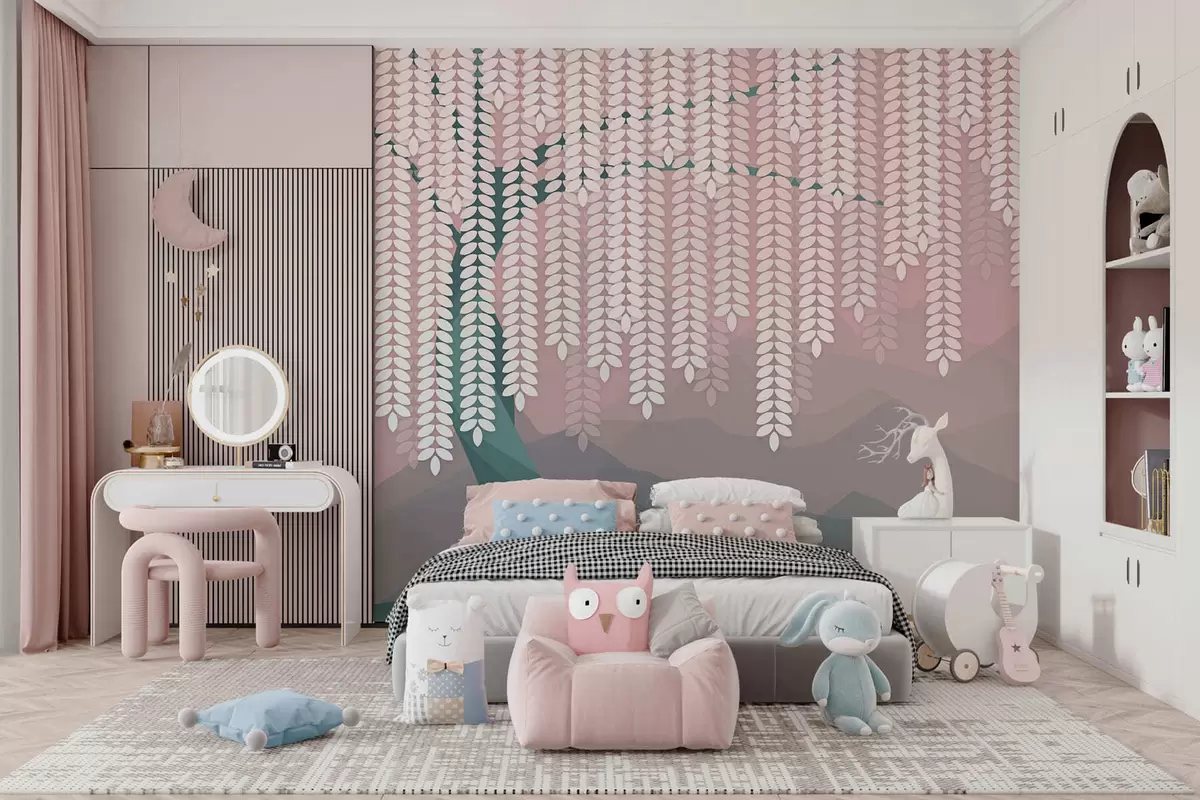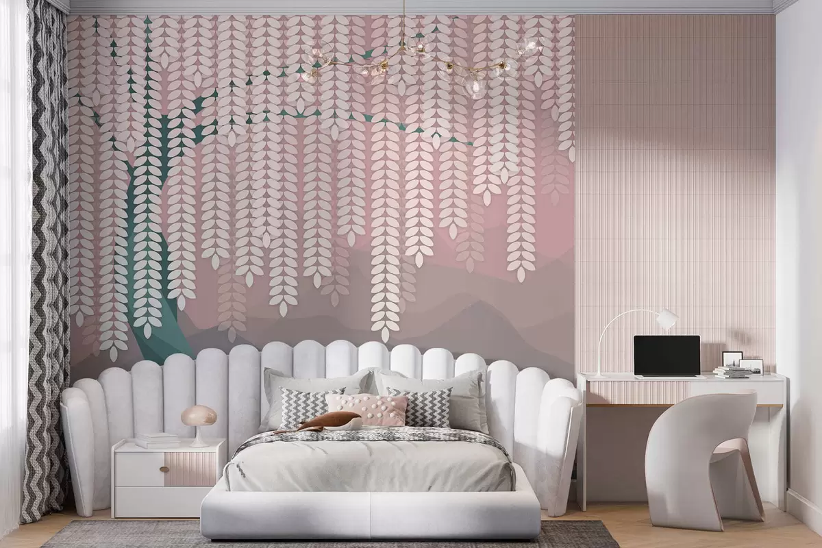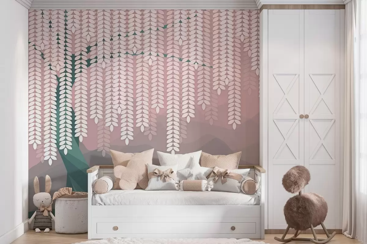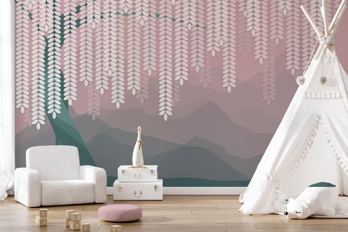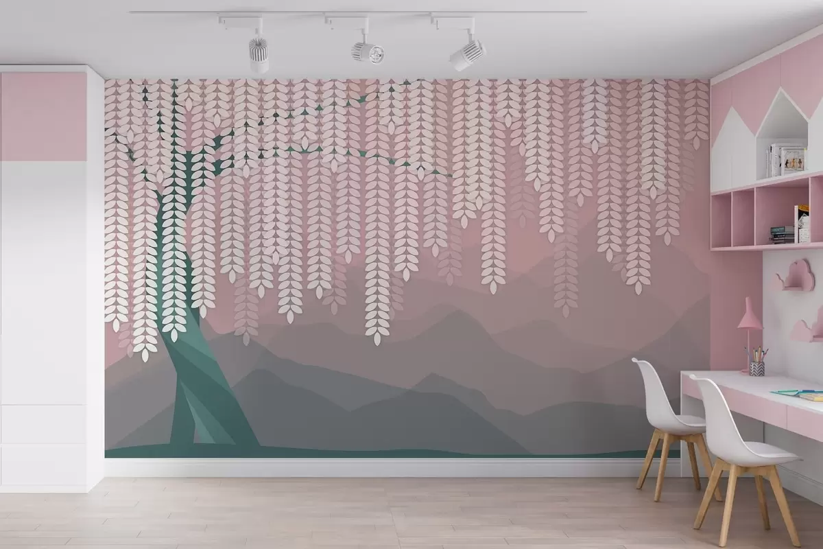 Fototapeten Stilisierter Weidenbaum mit herabhängenden Blättern vor dem Hintergrund minimalistischer Berge in Rosa- und Dunkelgrüntönen N° w05232v4