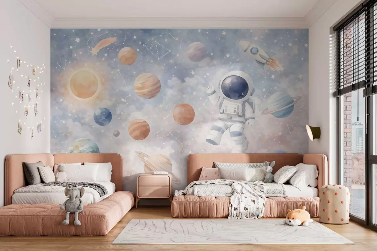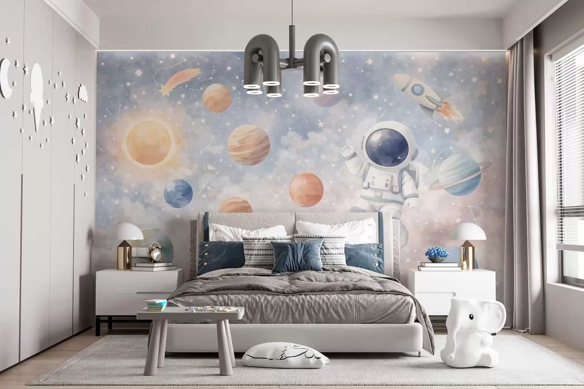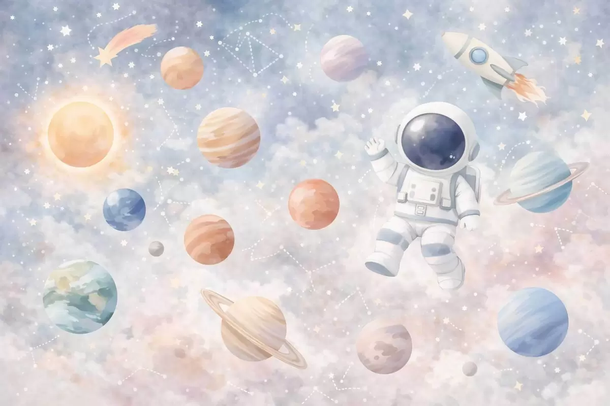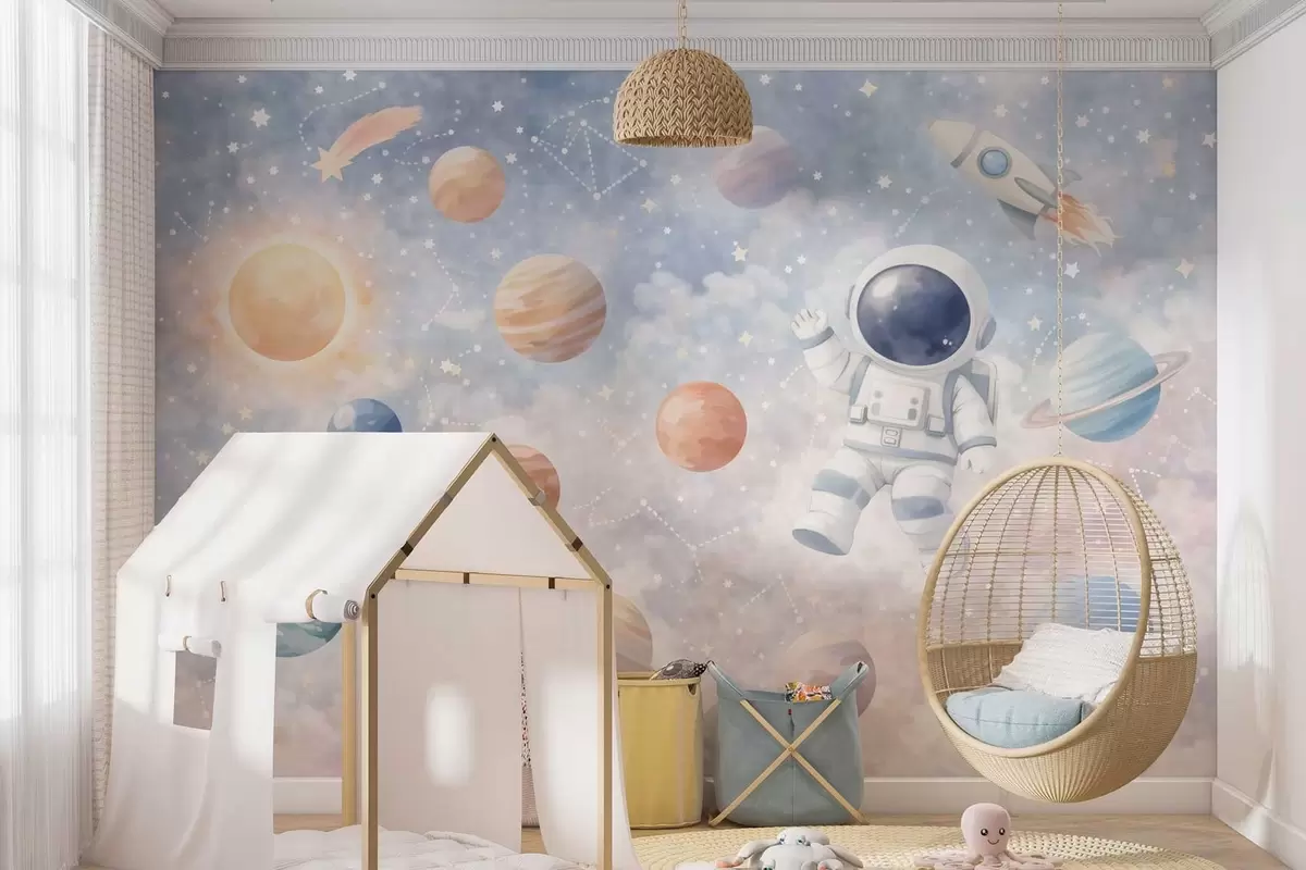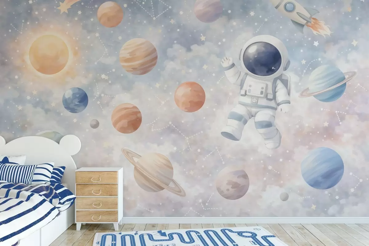 Fototapeten ein kleiner Astronaut zwischen Planeten und Sternen N° w05233