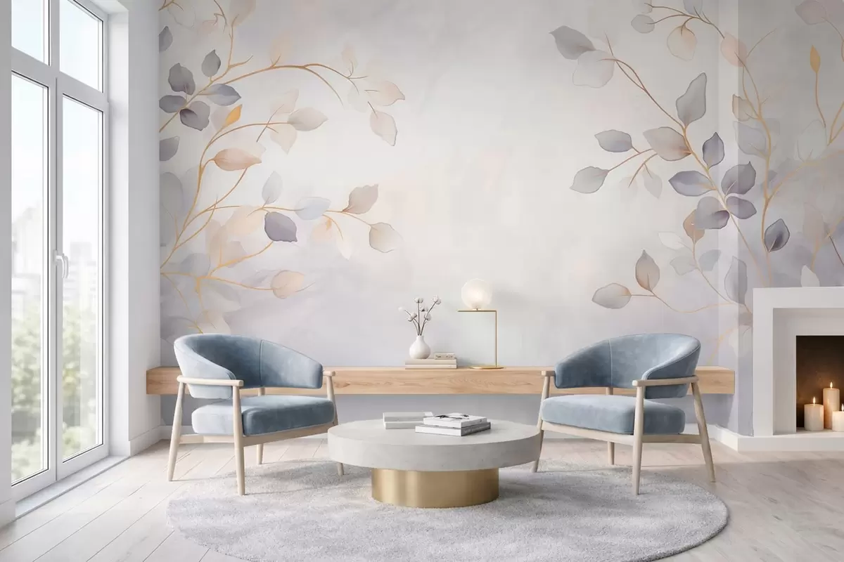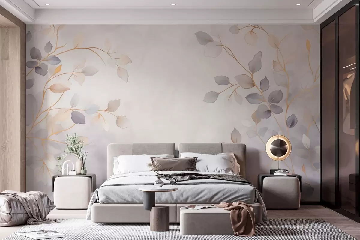 Fototapeten Zarte, blättrige Zweige vor einem sanft verschwommenen Hintergrund N° w05296