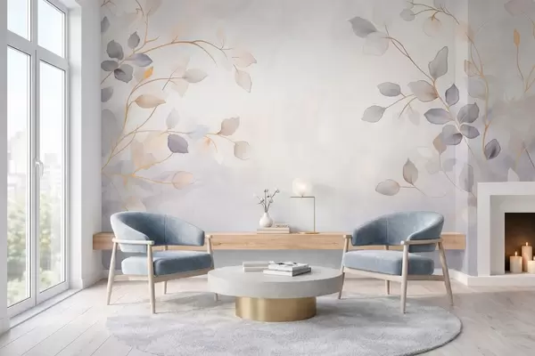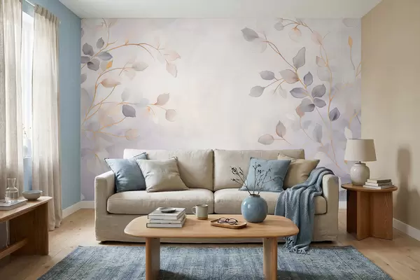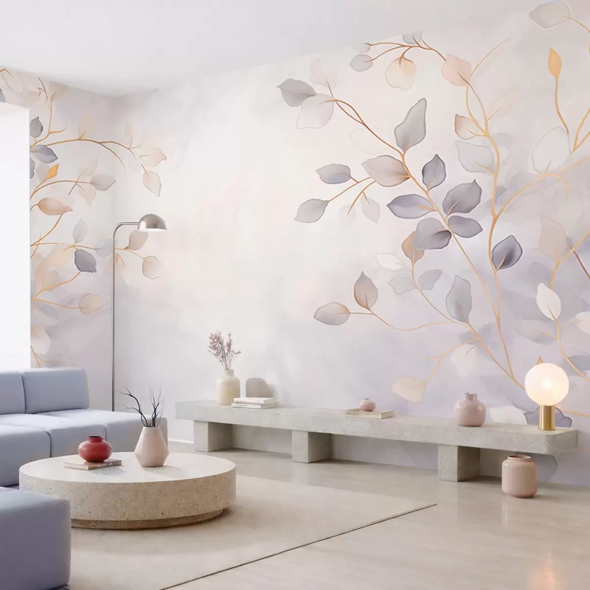 Fototapeten Zarte, blättrige Zweige vor einem sanft verschwommenen Hintergrund N° w05296