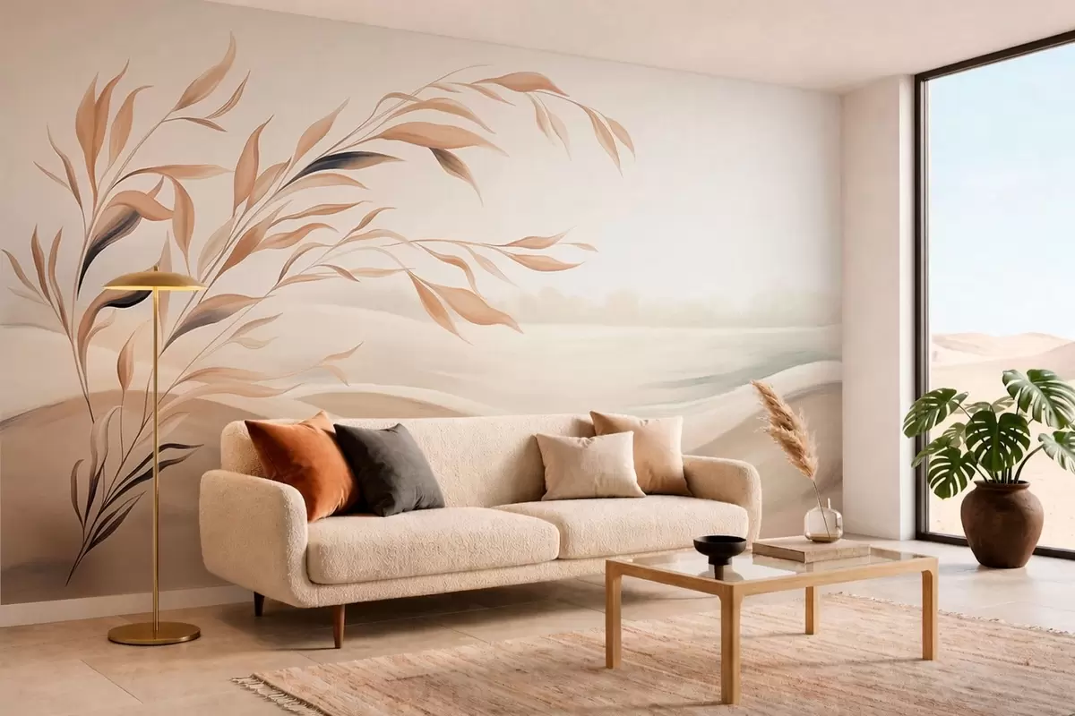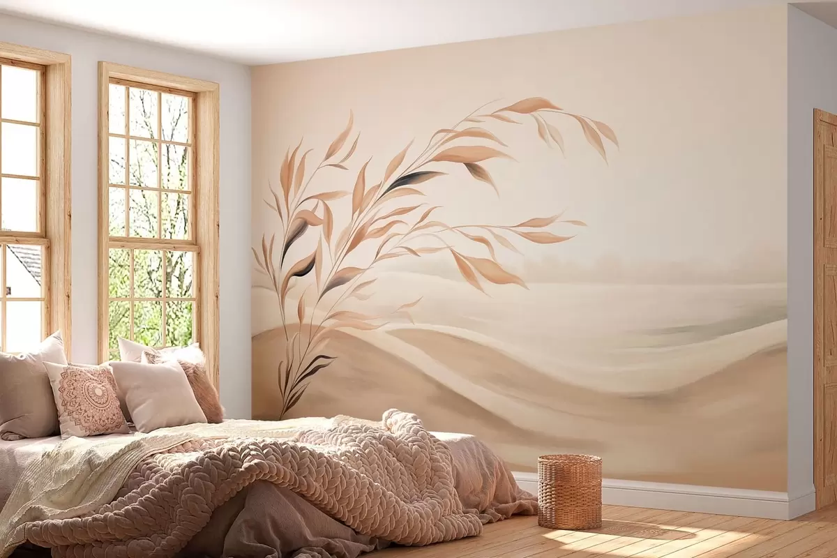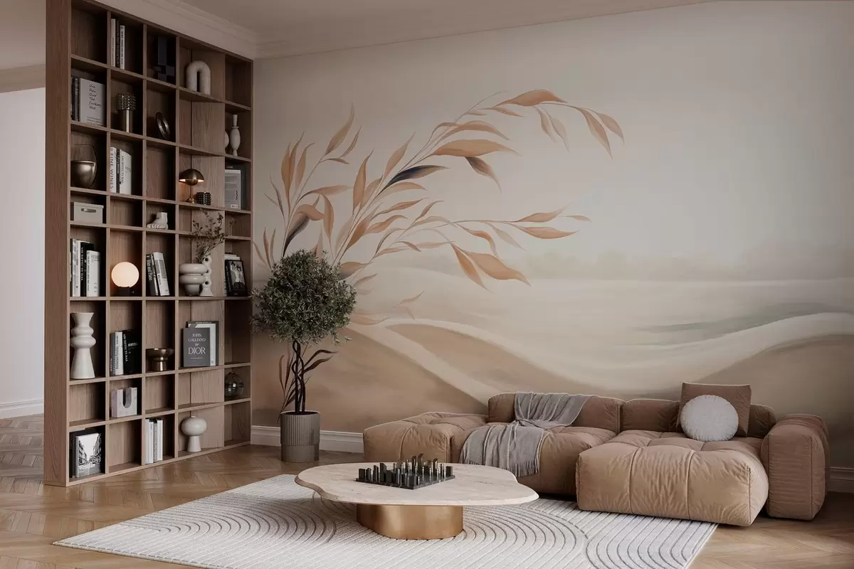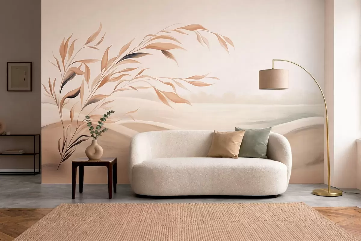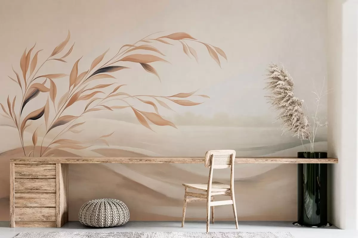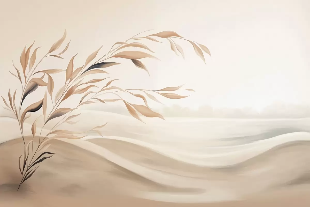 Fototapeten Eine sanfte Landschaft mit einem Ast über Hügeln in hellbeigen Farbtönen N° w05297
