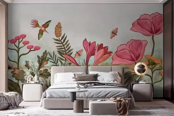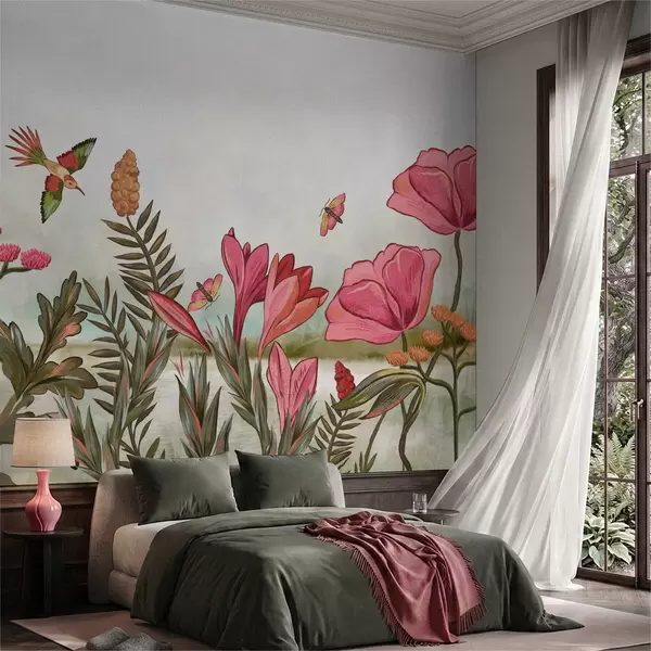 Fototapeten Leuchtende Blumen mit Vögeln und Schmetterlingen N° w05321