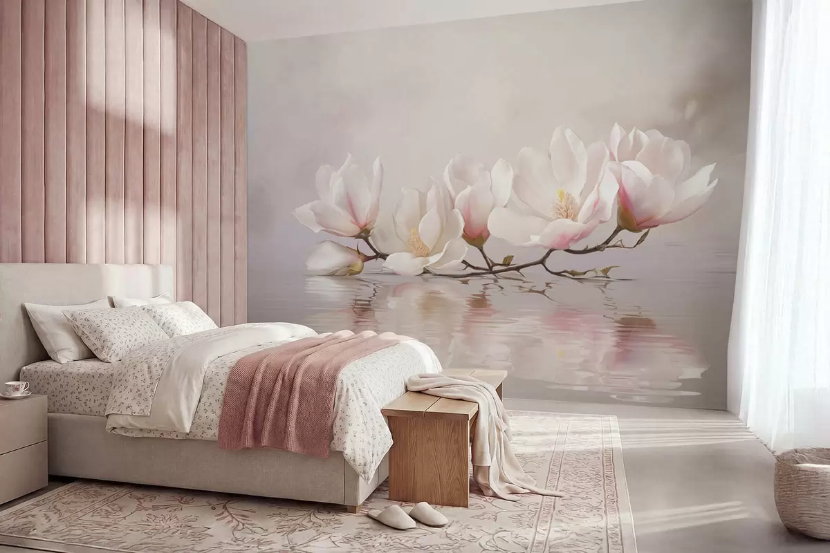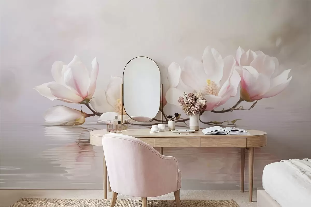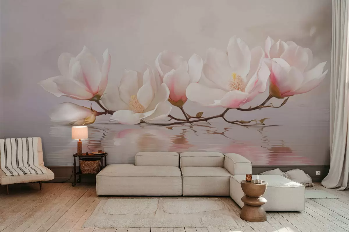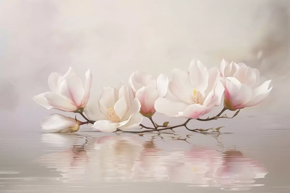 Fototapeten Magnolienzweig mit Blüten über ruhigem Wasserreflex N° w05353v1