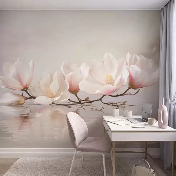 Fototapeten Magnolienzweig mit Blüten über ruhigem Wasserreflex N° w05353v1