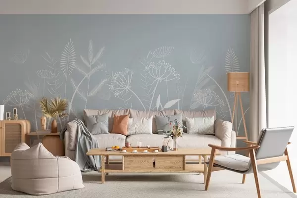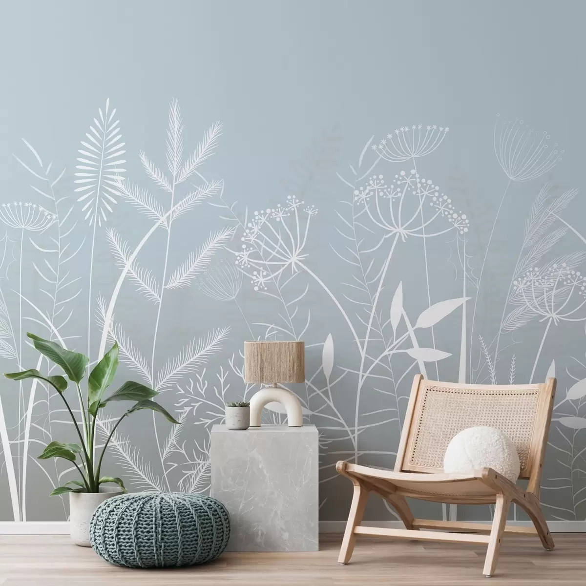 Fototapeten zarte, handgemalte Wildgräser und Blumen vor einem graublauen Hintergrund N° w05383