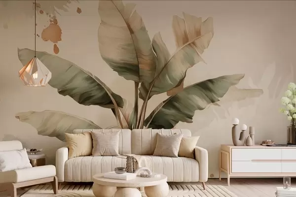 Fototapeten ein großes, malerisches Bündel Bananenblätter mit Spritzern im Retro-Stil N° w05384