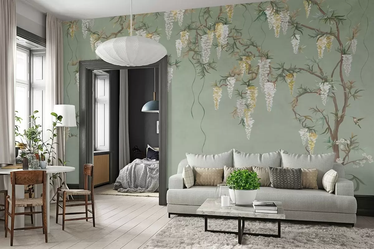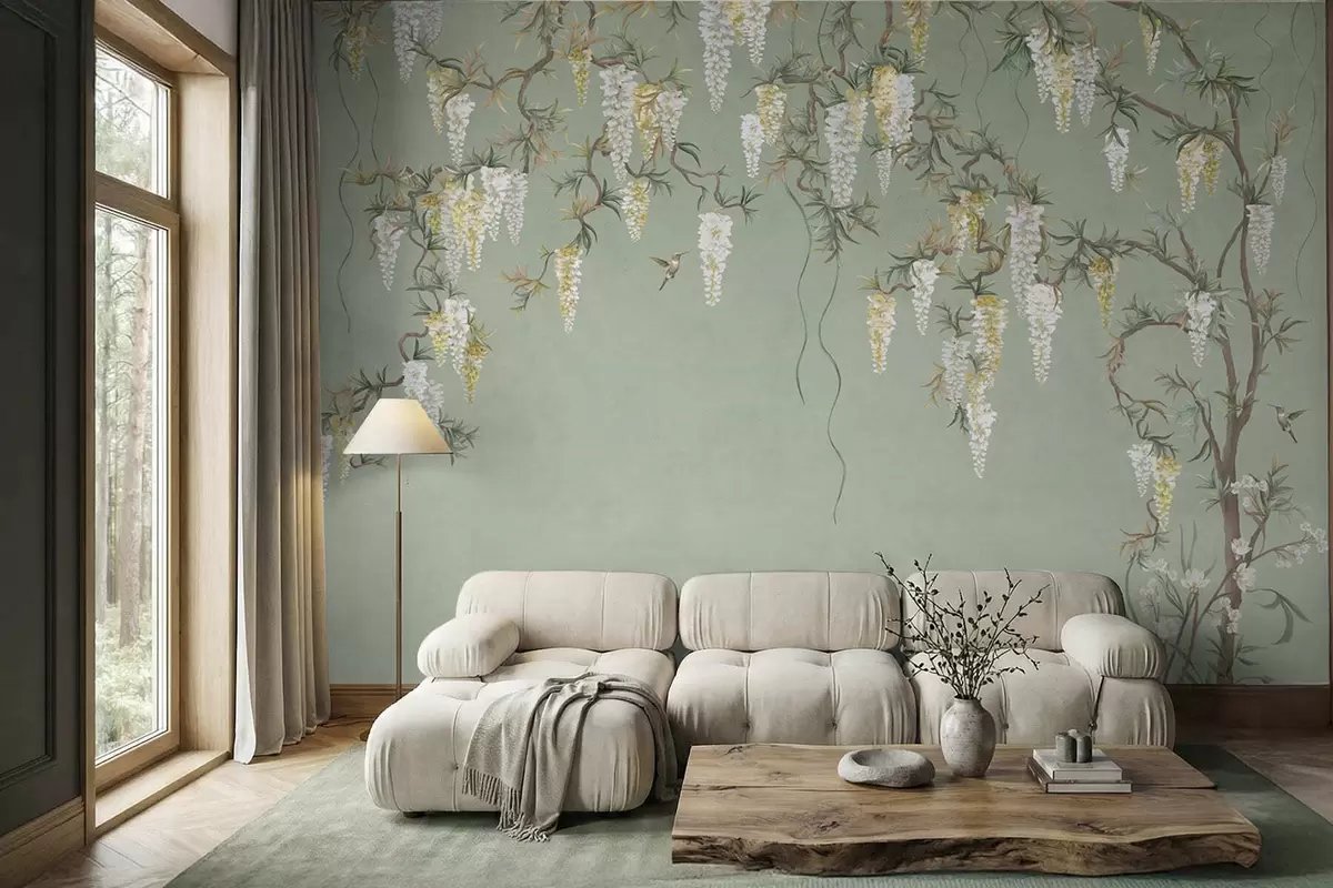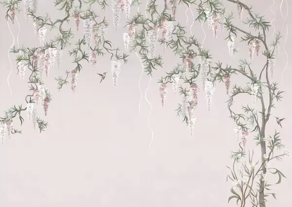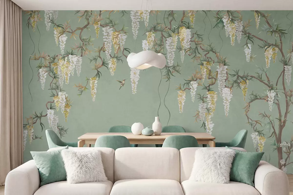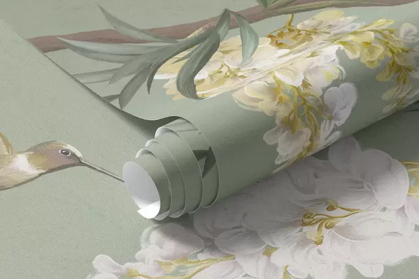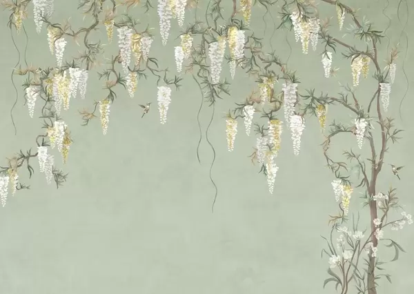 Fototapeten Blühende Zweige mit weißen Blüten und Vögeln auf grünem Hintergrund N° w05394