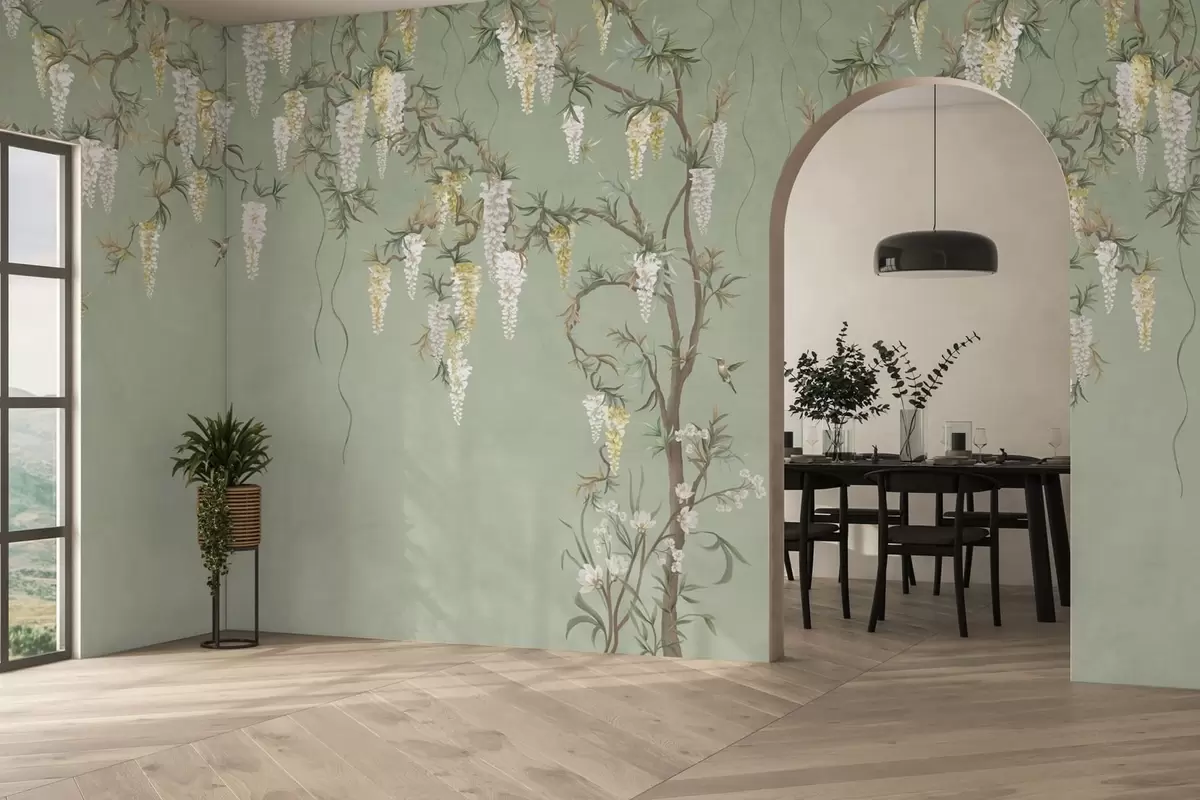 Sie können die Tapete sehr vorsichtig mit einem leicht feuchten Schwamm reinigen. Wir raten jedoch davon ab, die Tapete zu schrubben oder Reinigungsmittel zu verwenden, da dies die Oberfläche und die Farben der Tapete beschädigen kann.