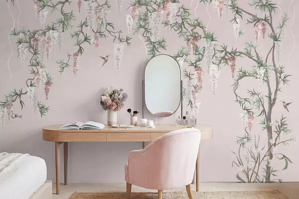 Fototapeten Blühende Zweige mit rosa Blüten und Vögeln N° w05394v1
