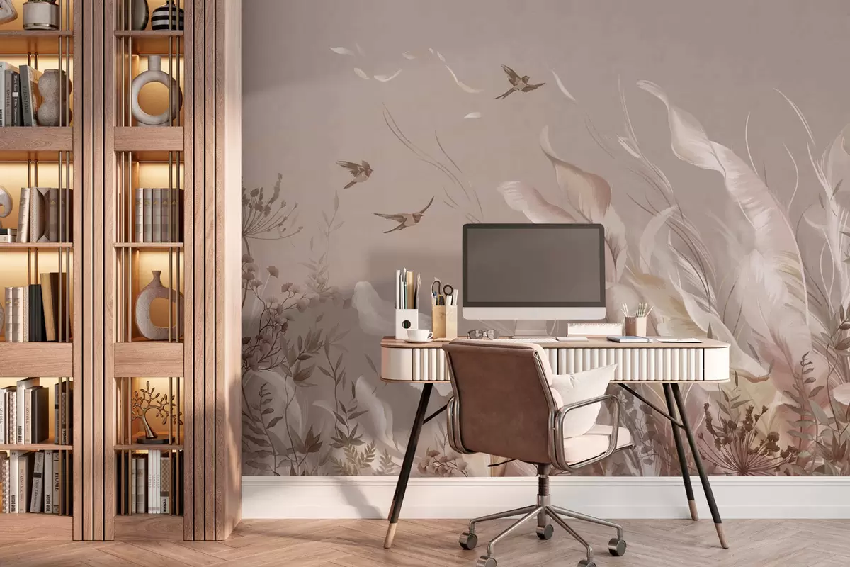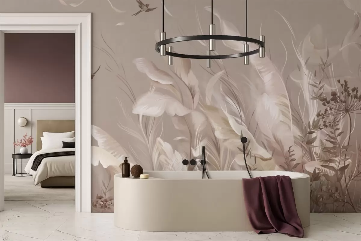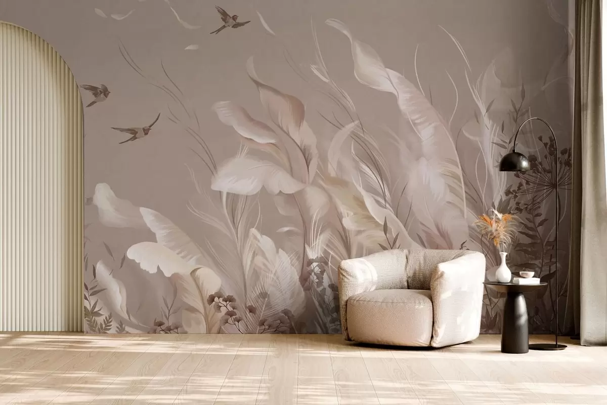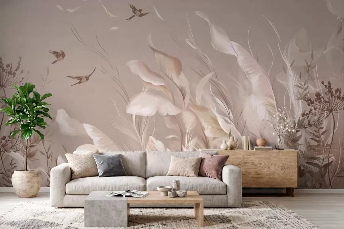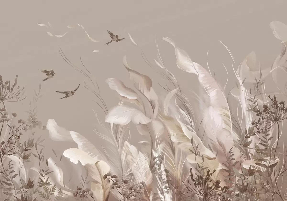 Fototapeten Leichte Federn und Pflanzen mit Vögeln in Pastelltönen N° w05395v1