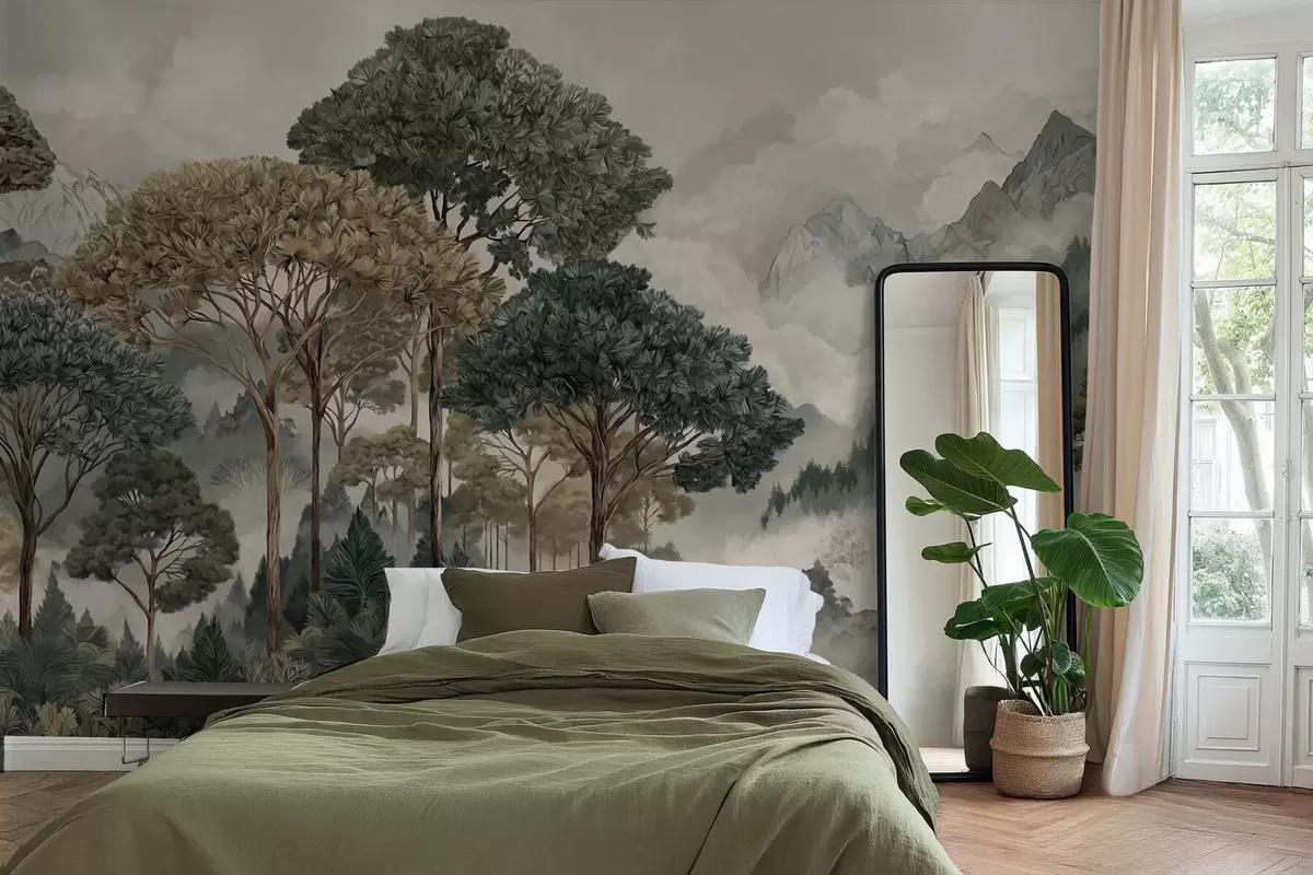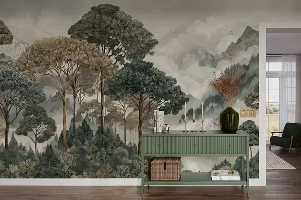 Fototapeten Berglandschaft mit Wald in sanften Farbtönen N° w05410v1