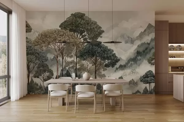 Fototapeten Berglandschaft mit Wald in sanften Farbtönen N° w05410v1