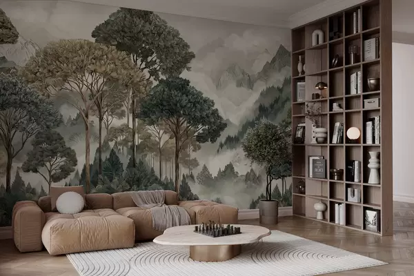 Fototapeten Berglandschaft mit Wald in sanften Farbtönen N° w05410v1