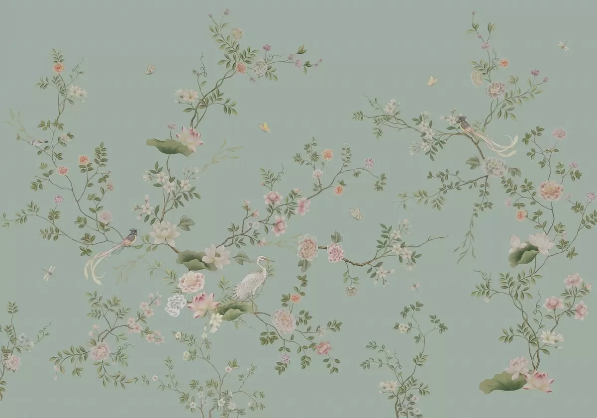 Fototapeten Blühende Zweige mit Vögeln auf blauem Hintergrund N° w05416v1