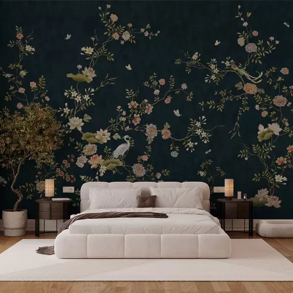 Fototapeten Blühende Zweige mit Vögeln vor dunklem Hintergrund N° w05416v3