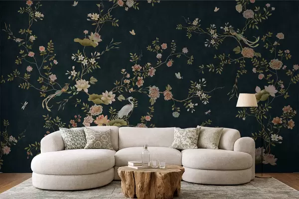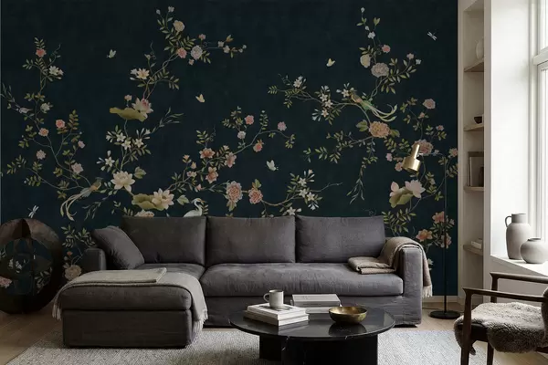 Fototapeten Blühende Zweige mit Vögeln vor dunklem Hintergrund N° w05416v3