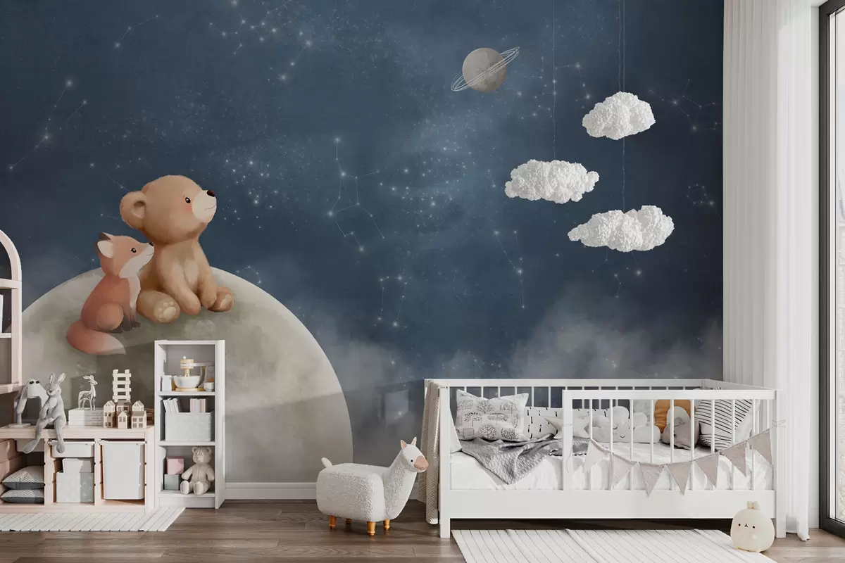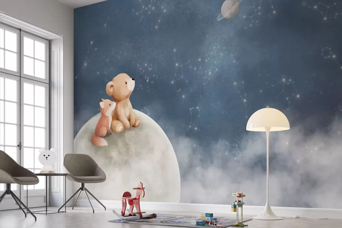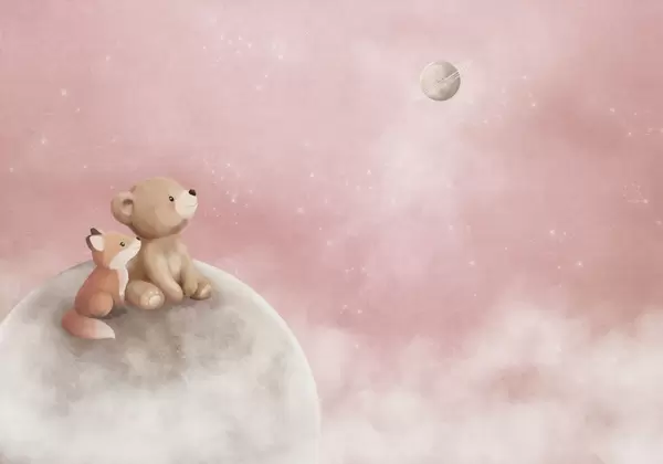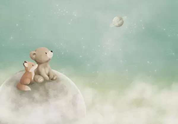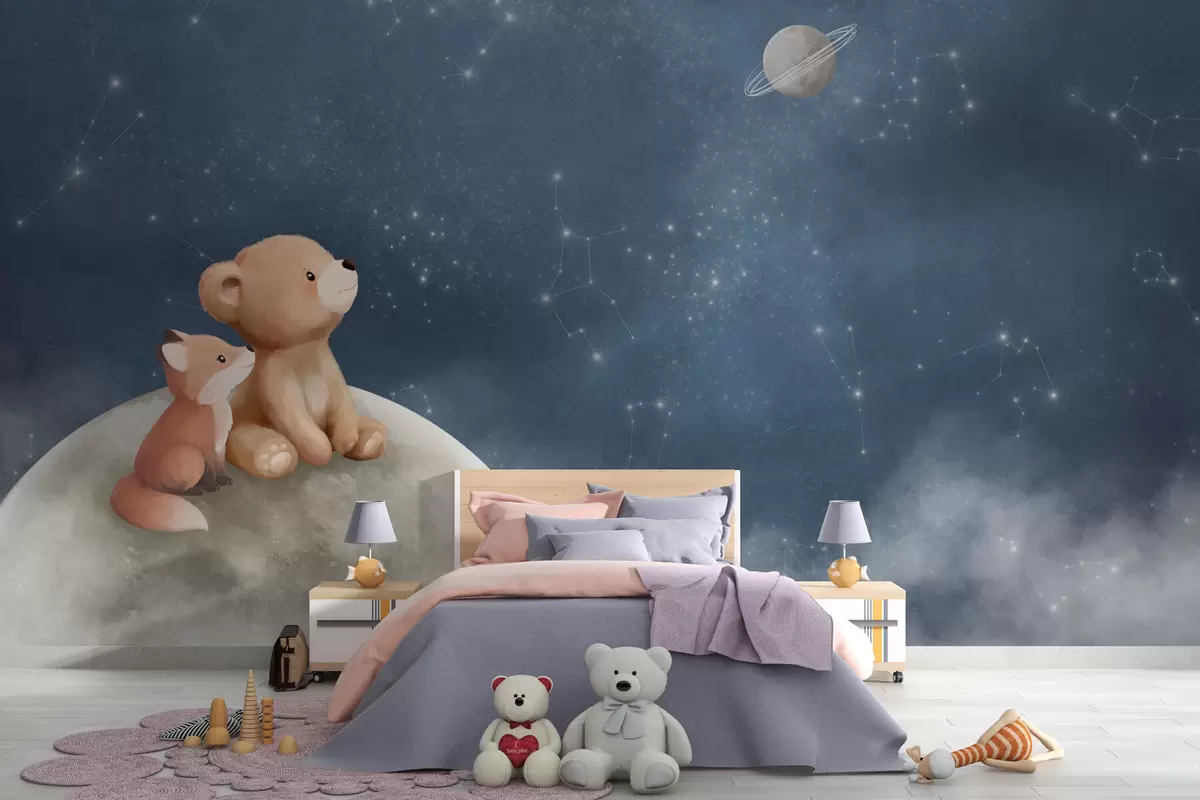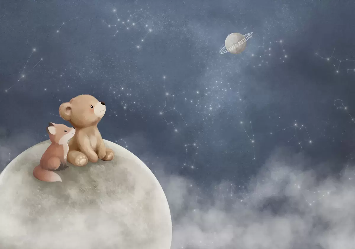 Fototapeten Pastellillustration: Bär und Fuchs vor dem Nachthimmel N° w05431