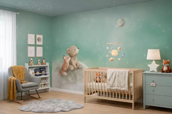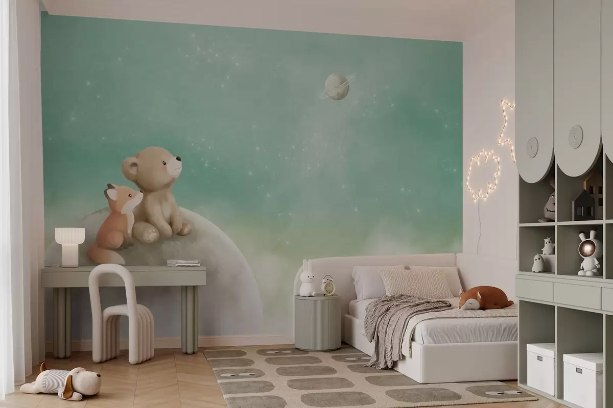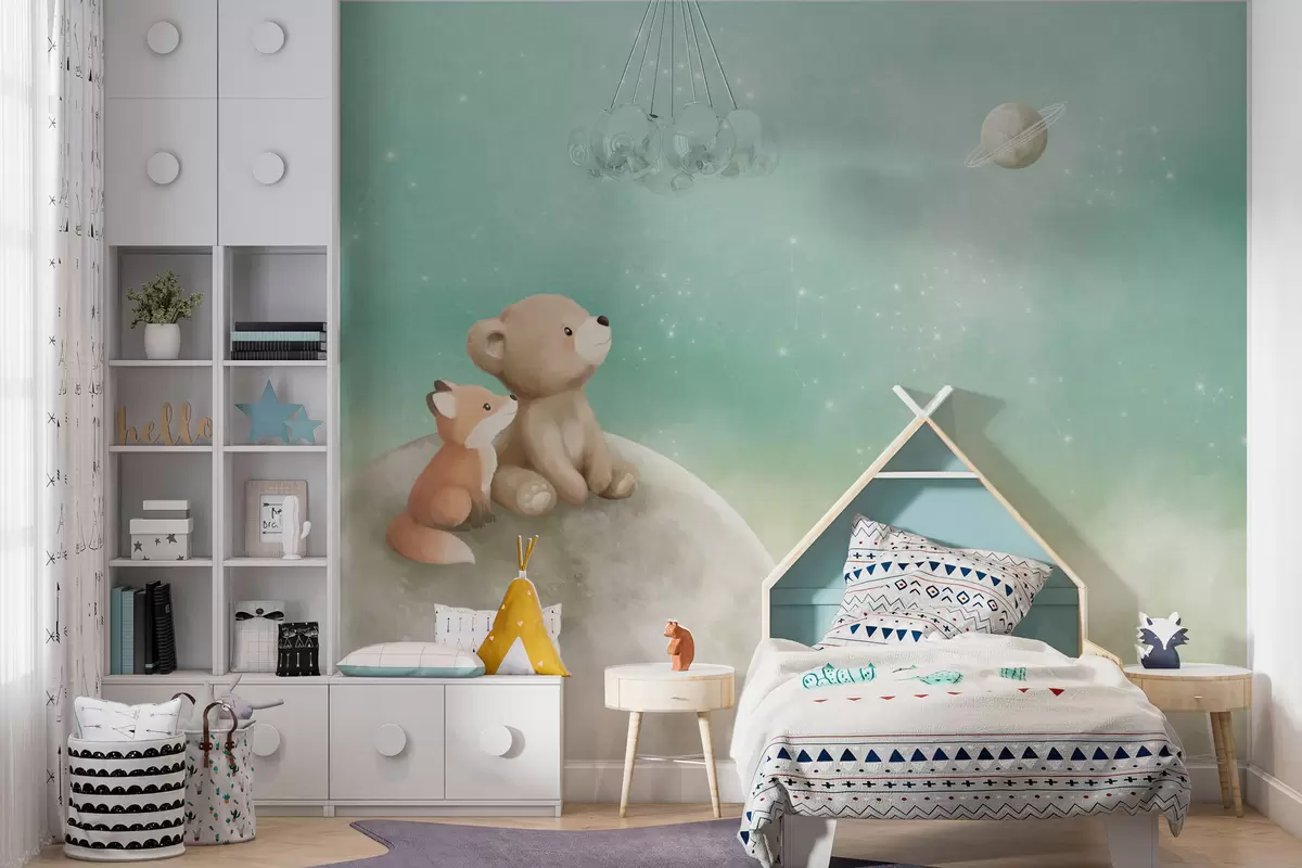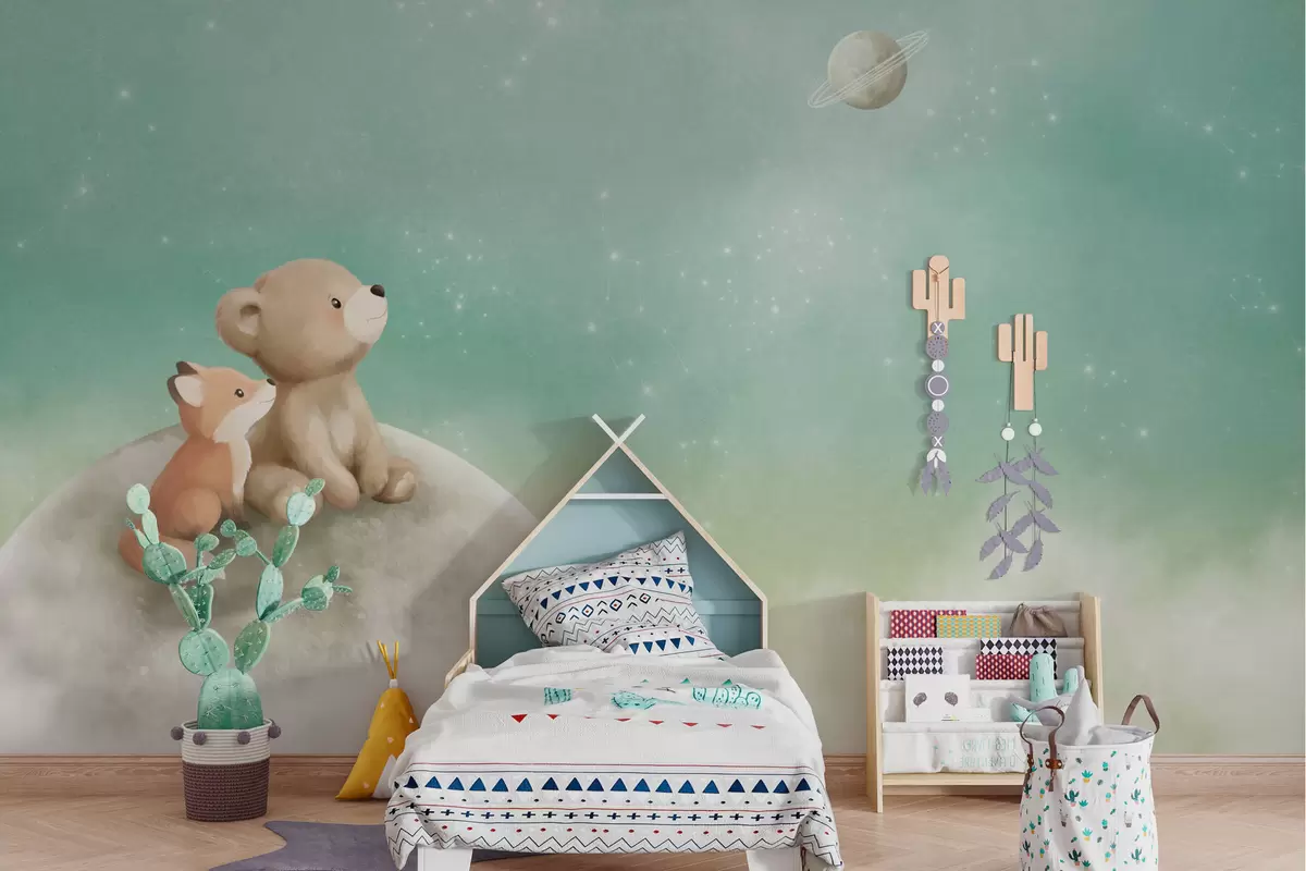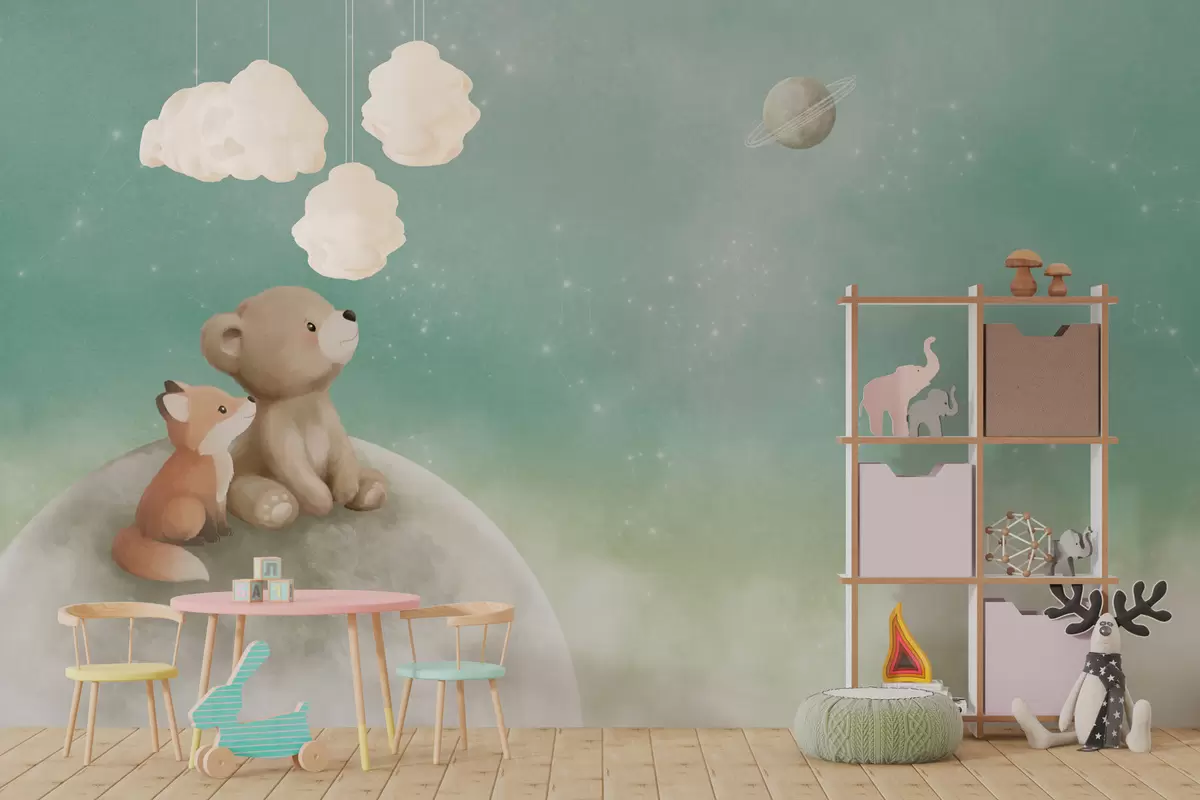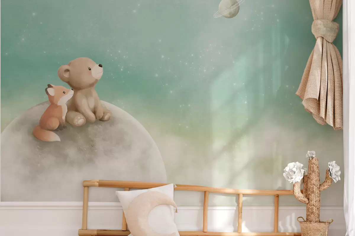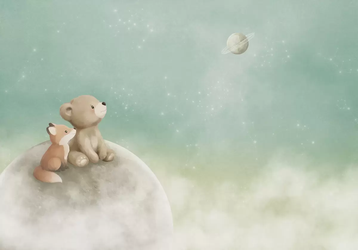 Fototapeten Pastellillustration: Bär und Fuchs vor grünem Himmel N° w05431v1