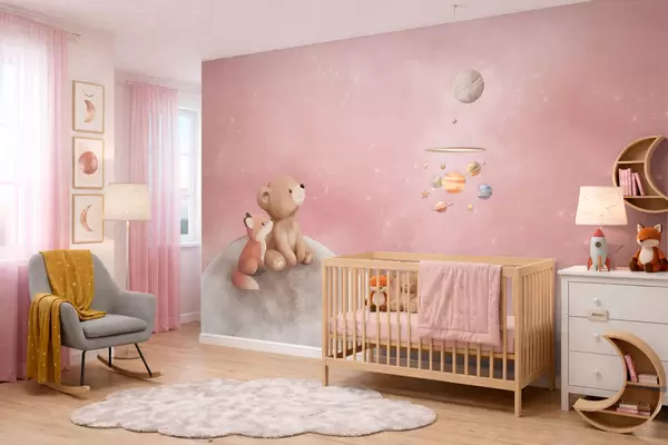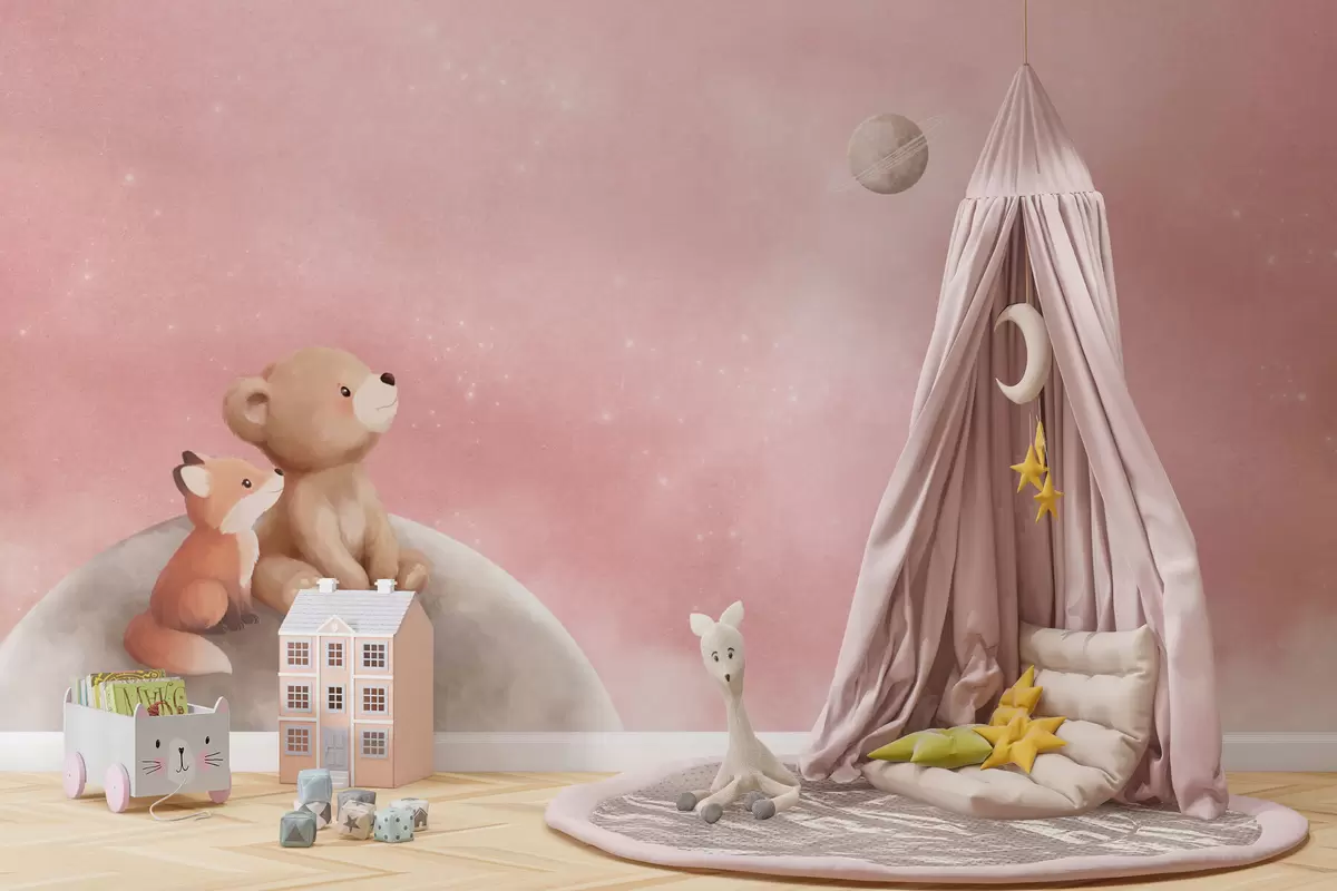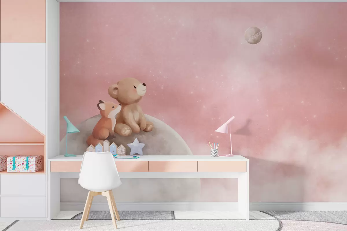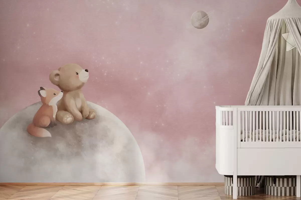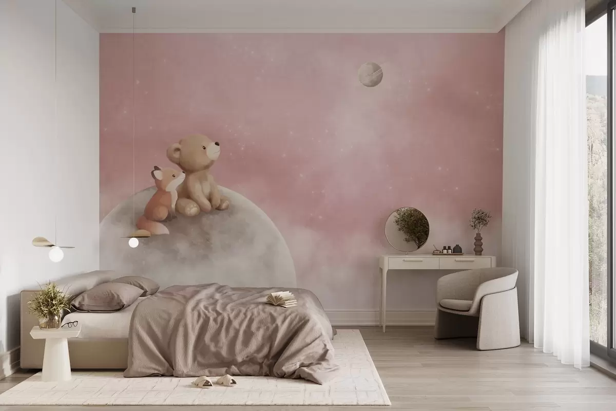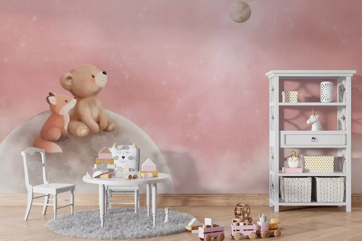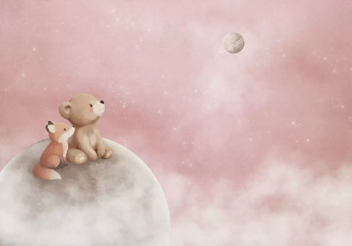 Fototapeten Pastellillustration: Bär und Fuchs vor einem rosa Mondhimmel N° w05431v2