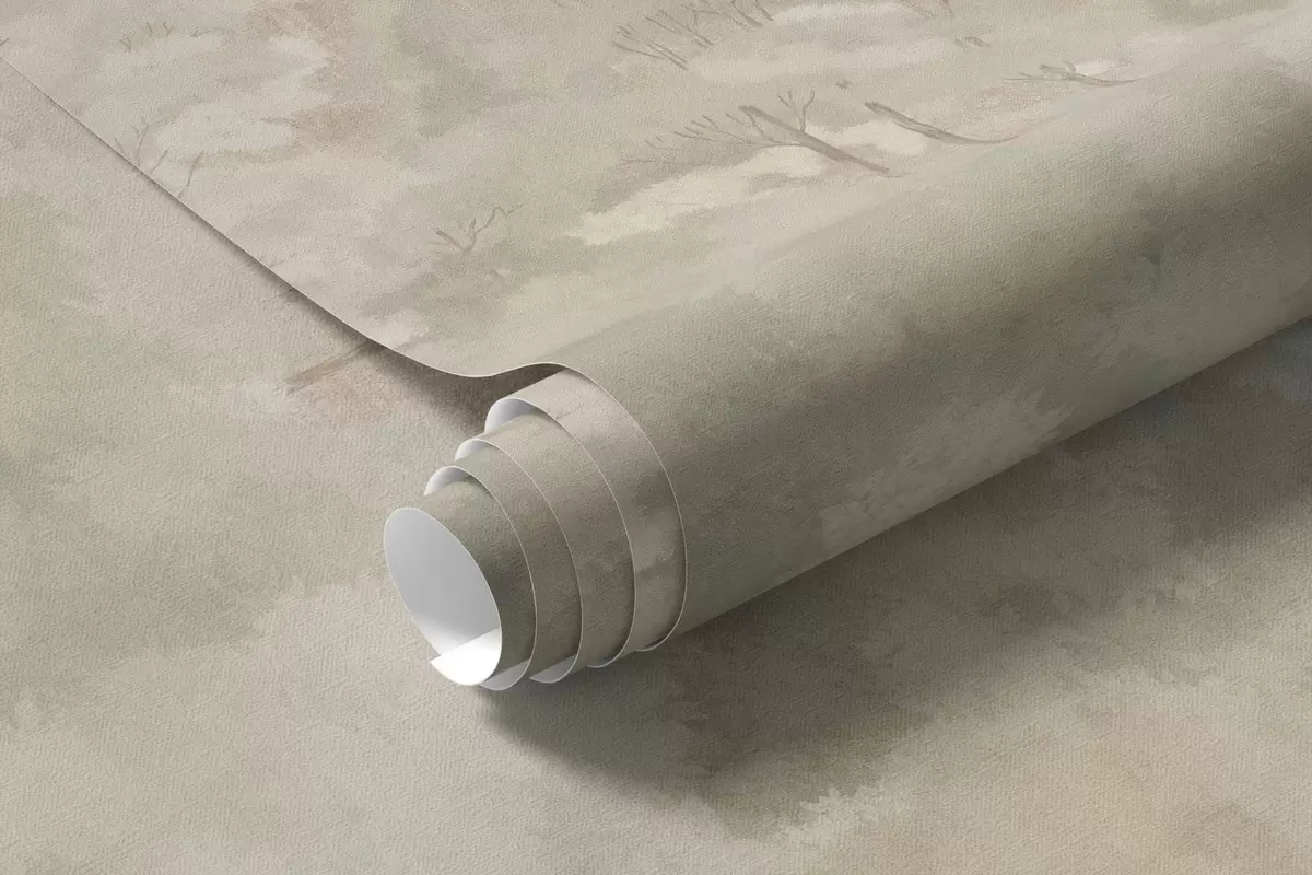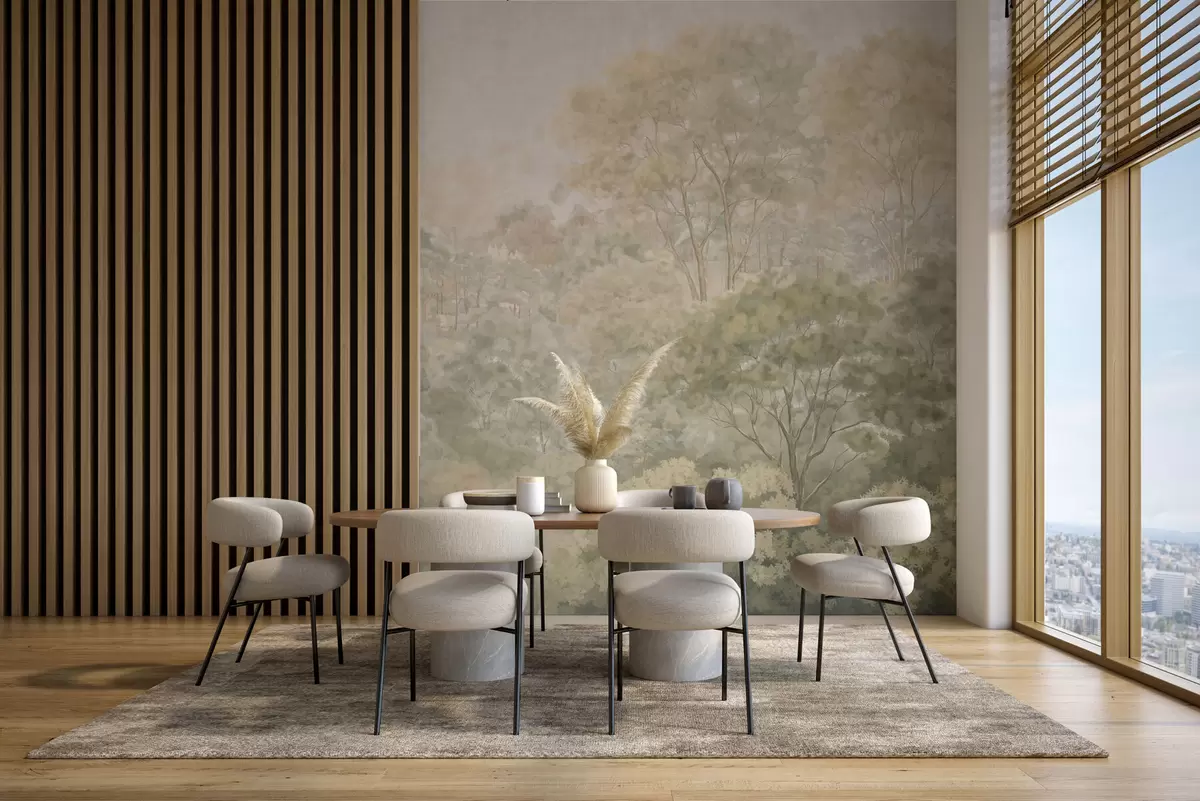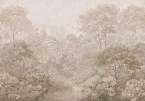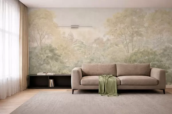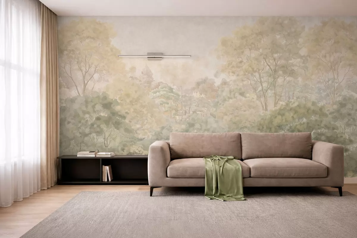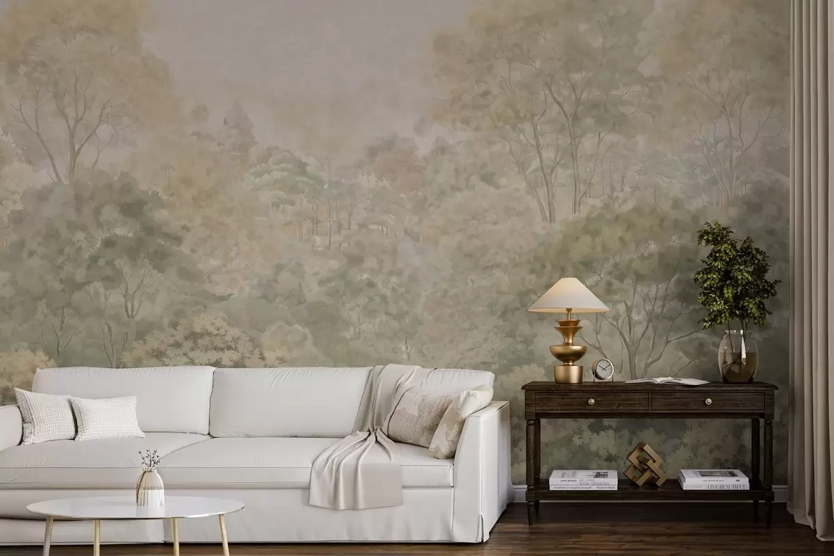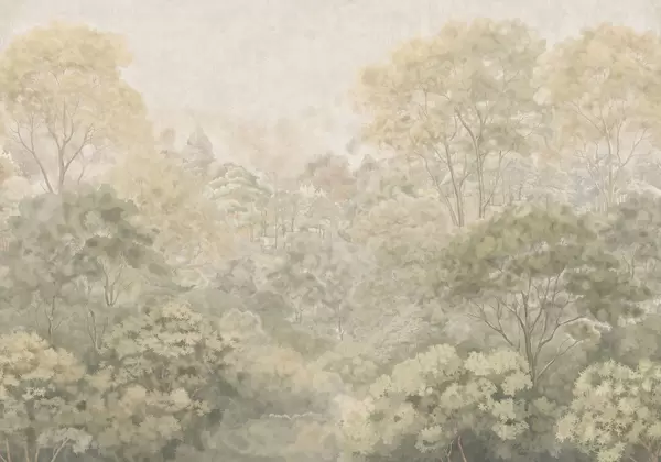 Fototapeten Eine Waldlandschaft im Vintage-Stil in gedämpften Grüntönen N° w05433