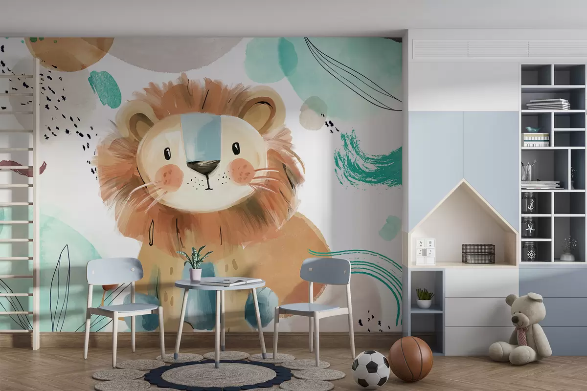 Fototapeten Ein süßer Cartoon-Löwe vor einem farbenfrohen, abstrakten Hintergrund mit Pinselstrichen und Spritzern in Pastellfarben. N° w07924